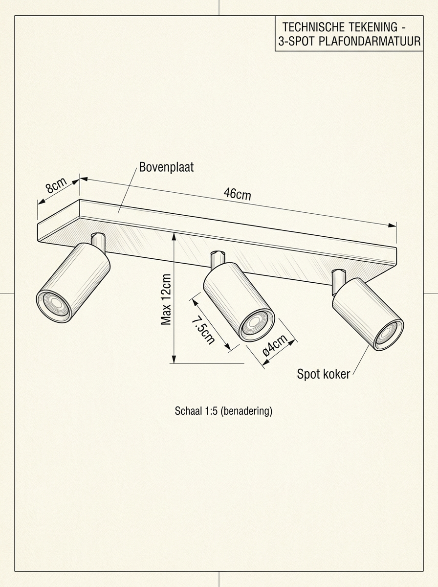Met een lengte van 46 cm en een diameter van 8 cm heeft deze 3-lichts balkspot een compact en strak design. De drie spots zijn richtbaar, waardoor je het licht eenvoudig kunt richten op de plek waar je het nodig hebt. Ideaal voor het uitlichten van een werkblad, wand, kunstobject of specifieke zone in de ruimte.