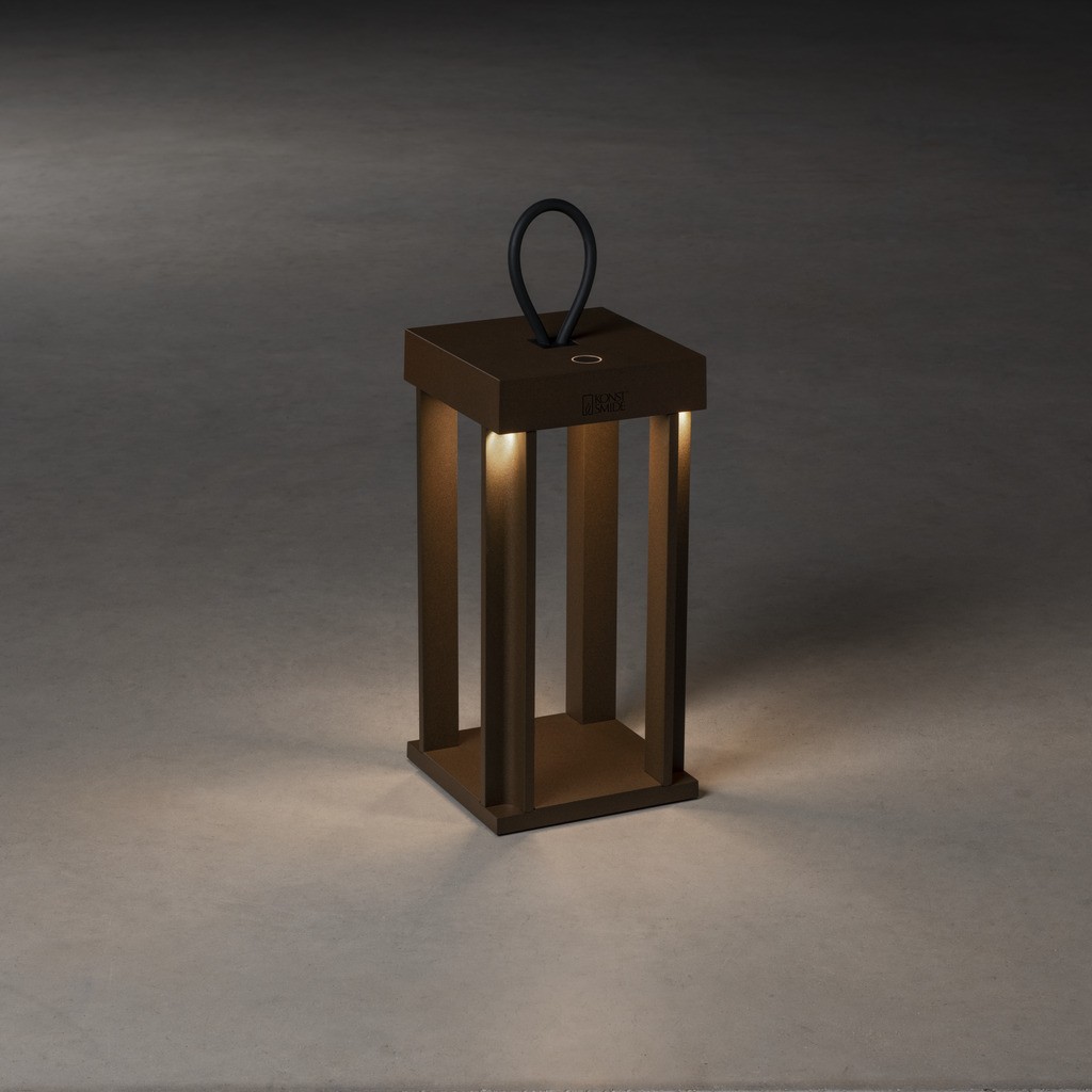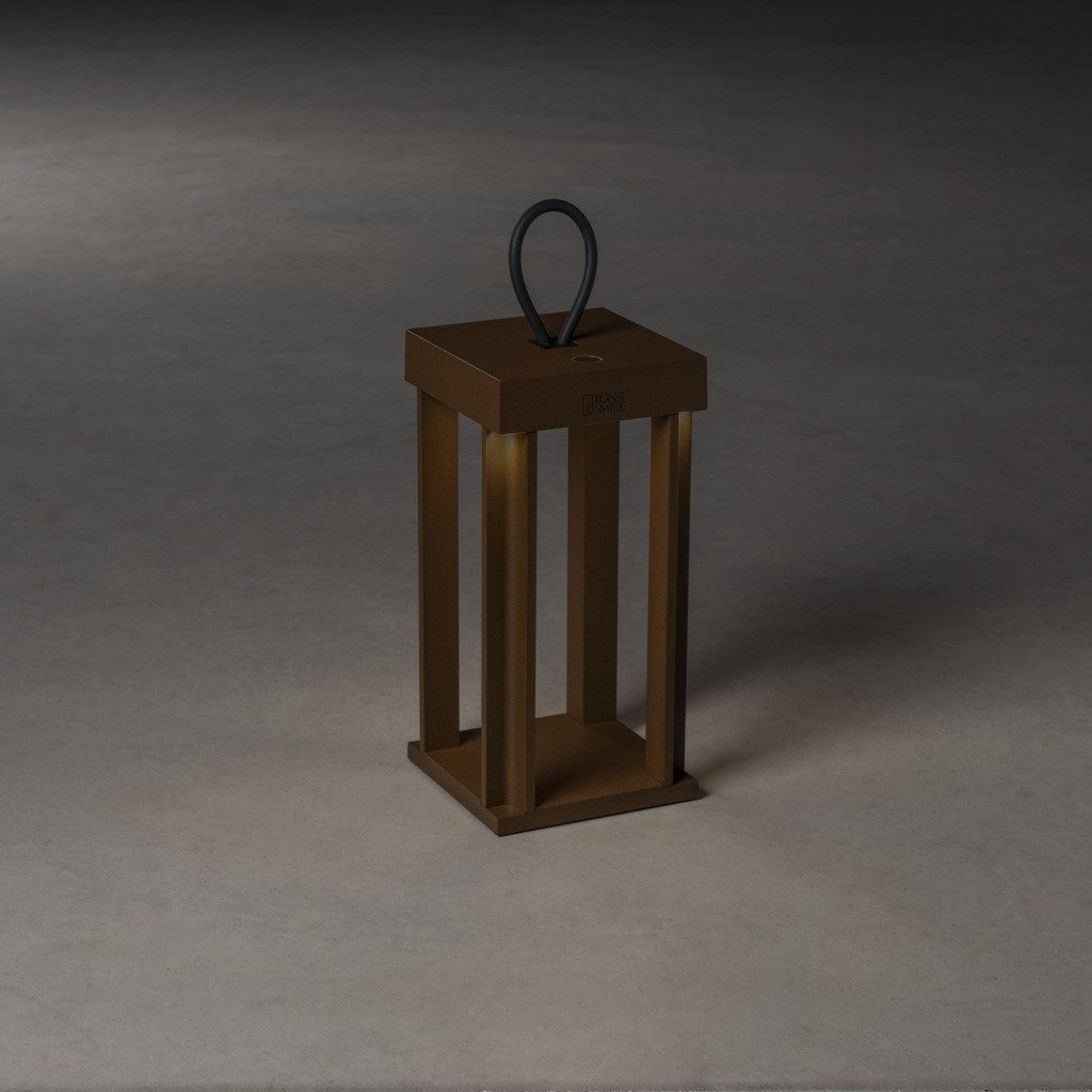 Cannes LED IP54 draadloze lounge/tafel/vloer/terraslamp roestbruin 15x42cm bxh, USB base en USB 1.5m oplaadsnoer, touch switch, traploze dimmer 5-100%, 3 lichtstanden (ambiance/functional/combi), 2700K of 3000K (extra) warmwit, 2x Lithium batterij 2200mA, 9u/100% – 20u/50%, 9u licht op vol vermogen; laadtijd snellader/Quick Charge 2.5u, normaal laden 6u, 2.2W/3.7V