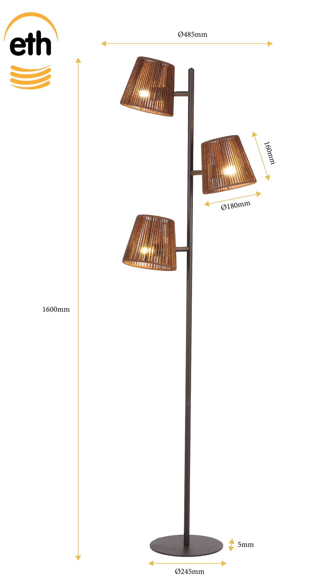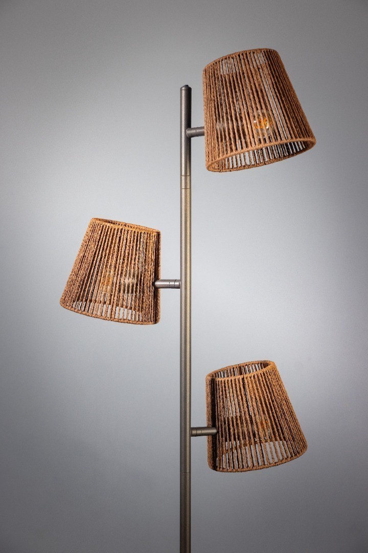 De ETH Daan vloerlamp is een opvallend pronkstuk uit de Daan collectie. Het metallic Anodic Brown armatuur in combinatie met de rotan kapjes geeft een warme, natuurlijke uitstraling en past perfect in zowel moderne als bohemian interieurs. Met drie E27 fittingen (max. 15W per lamp) biedt deze vloerlamp sfeervol en direct licht. Bovenop de stang zit een aan-/uitschakelaar waarmee de lampen eenvoudig te bedienen zijn (niet afzonderlijk). Combineer hem met de Daan tafellamp voor een harmonieus geheel in uw interieur.