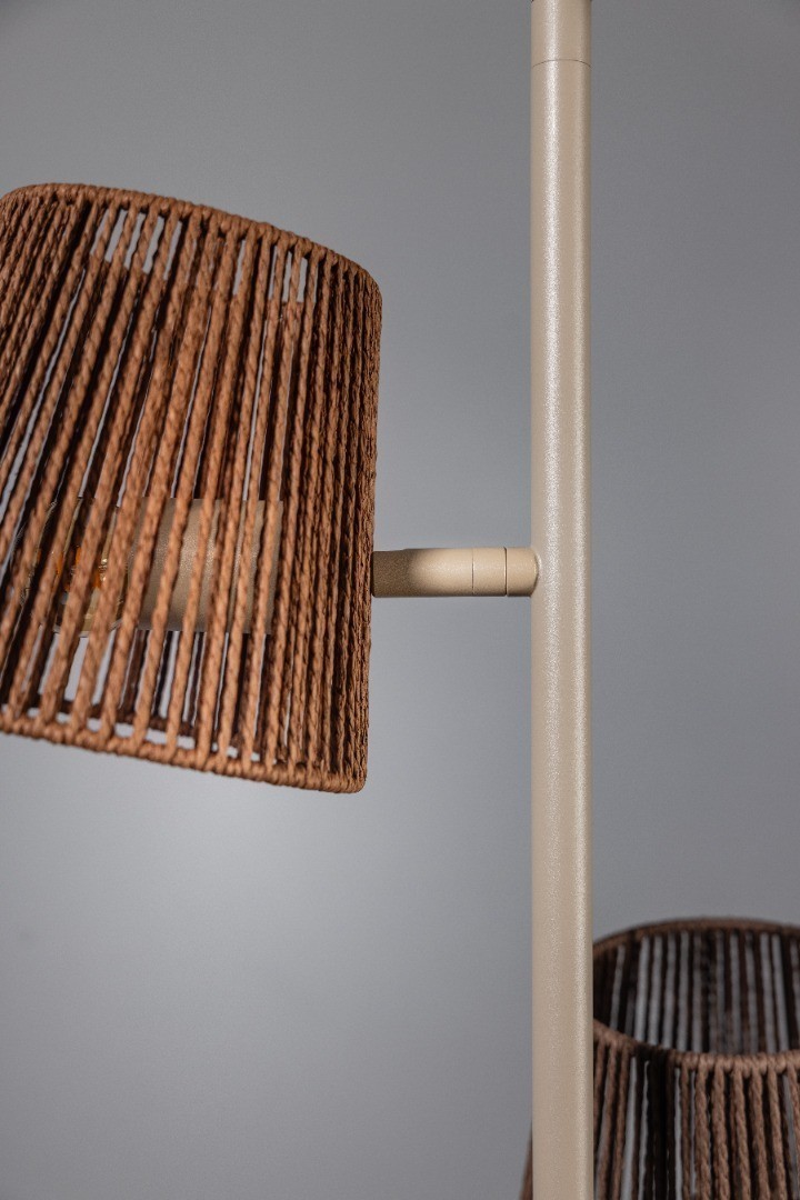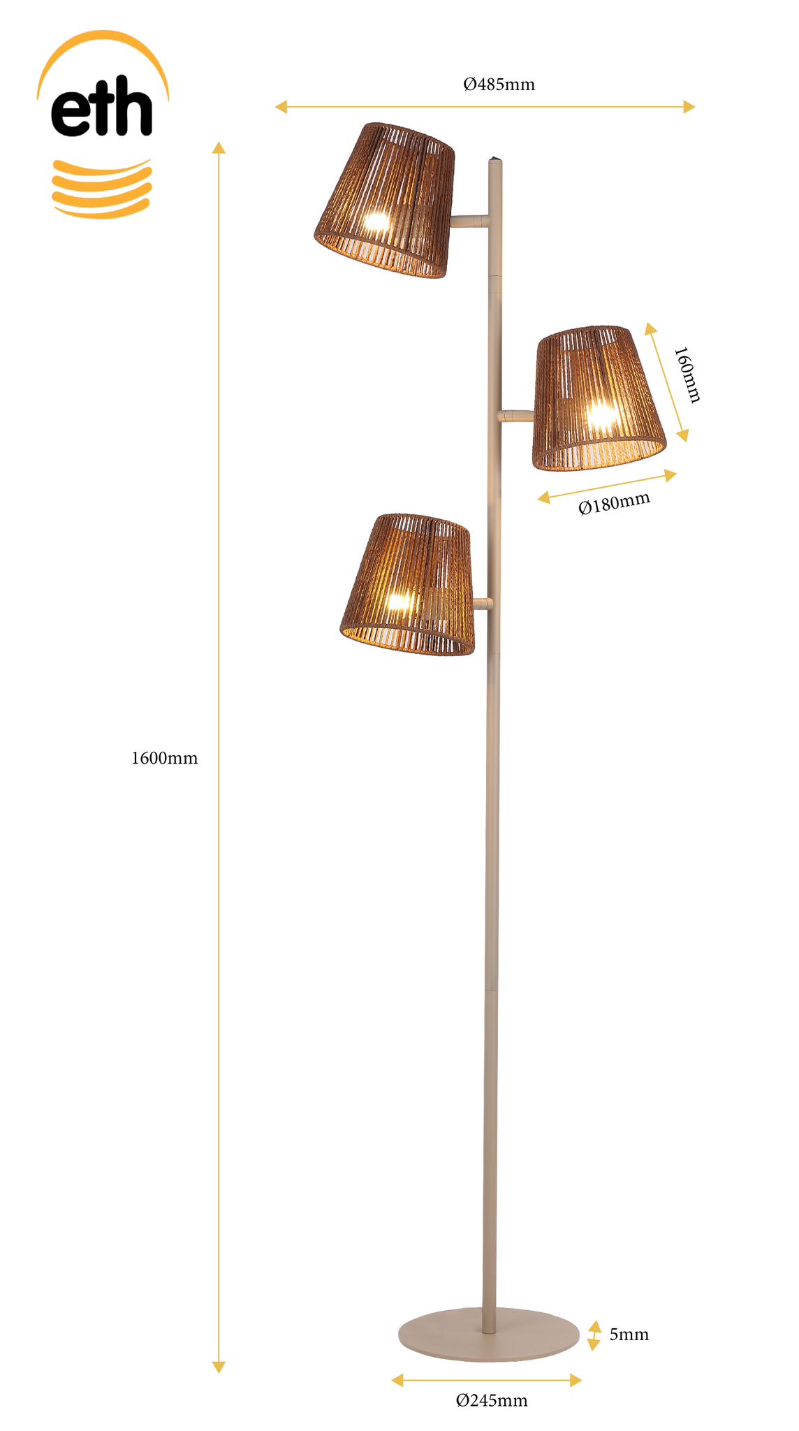 De ETH Daan vloerlamp is een opvallend pronkstuk uit de Daan collectie en vormt samen met de tafellamp en de 2-lichts vloerlamp een prachtig geheel. Het zandkleurige armatuur past perfect in een landelijk of modern interieur. De 3 rotan kapjes geven de lamp een unieke uitstraling en creëren een sfeervol lichteffect wanneer de lamp brandt. Bovenop de stang zit een aan-/uitschakelaar waarmee de lampen eenvoudig (niet afzonderlijk) te bedienen zijn. De vloerlamp is voorzien van 3x E27 fitting, geschikt voor ieder 15W, zodat u zelf de lichtbron kunt kiezen.