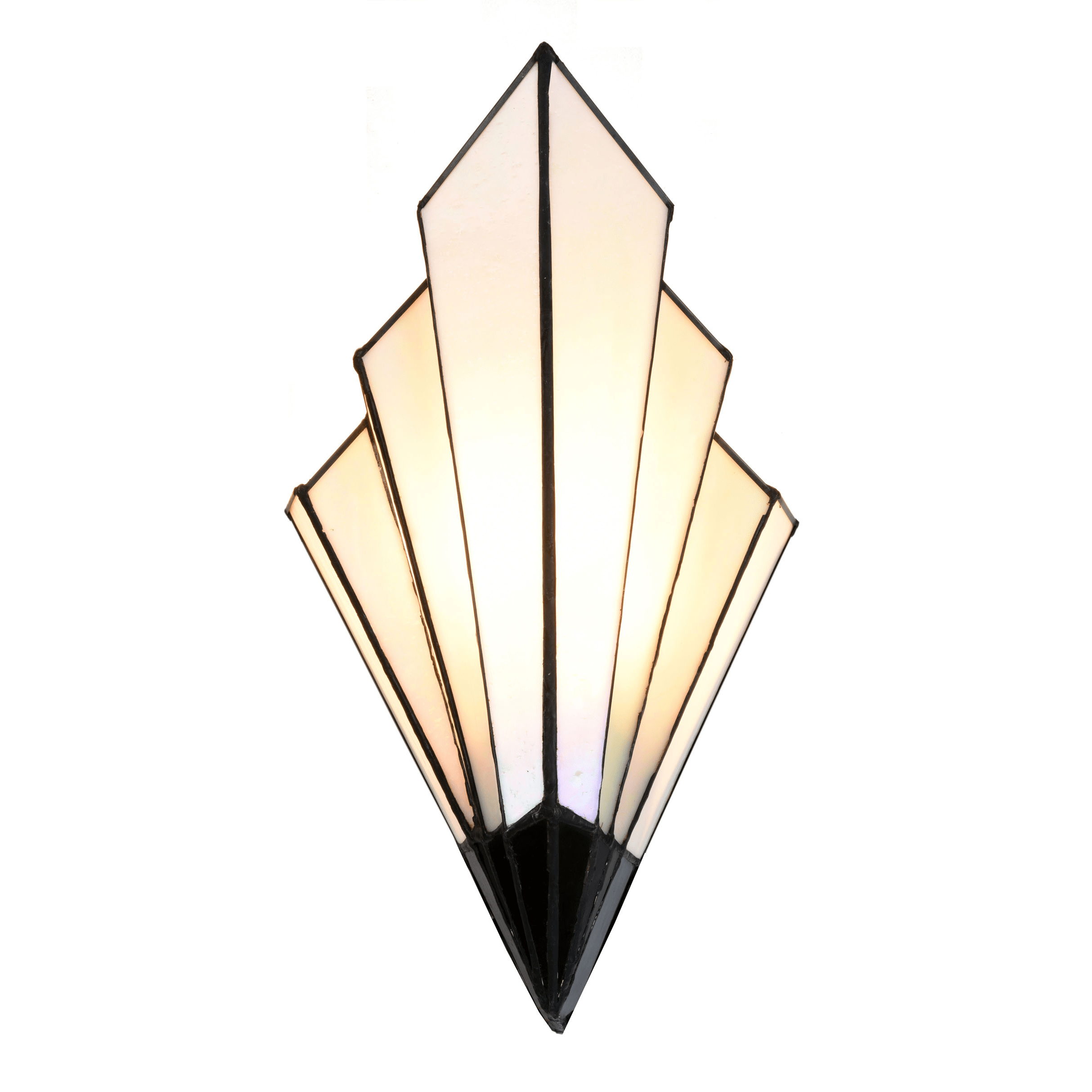 Het kenmerkende gebruik van gekleurd glas resulteert in verbluffende patronen en kleurschakeringen. Het paarlemoer glas in combinatie met het zwarte armatuur zorgt voor een prachtig contrast dat direct de aandacht trekt. Deze wandlamp is perfect te combineren met andere Tiffany verlichting en het Coloured Art Deco paneel uit de Art Deco serie.