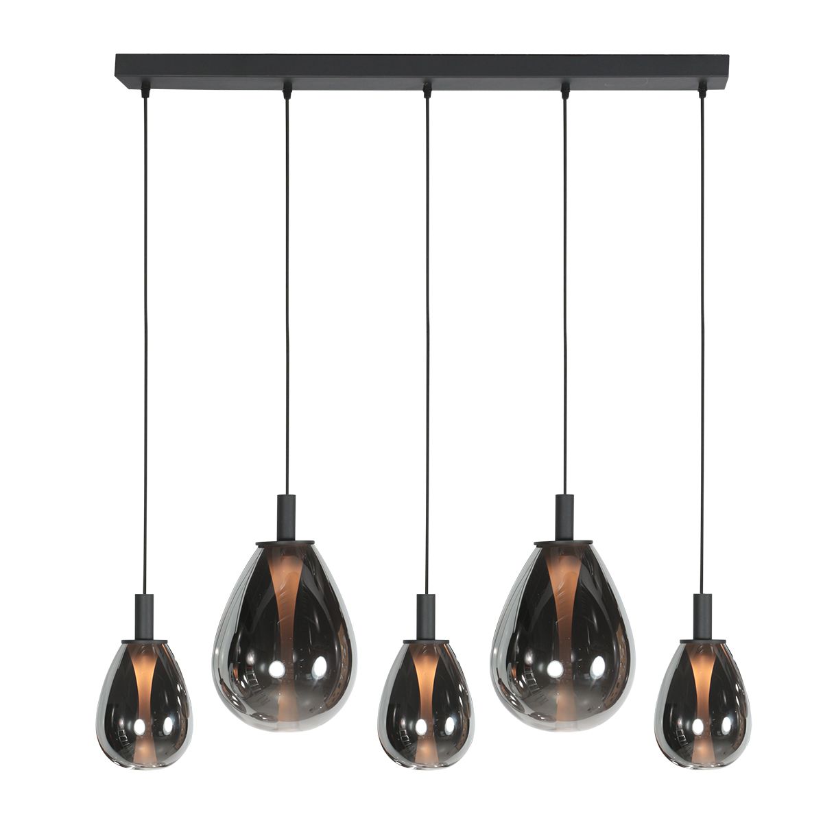 De Glimsy 4197ZW is een stijlvolle 5-lichts hanglamp die perfect past in een modern interieur. Met zijn strakke zwarte afwerking en een combinatie van twee verschillende formaten smoke glazen (twee grote en drie kleine) brengt deze lamp een speels en elegant effect in elke ruimte. De Glimsy 4197ZW is ideaal voor boven de eettafel, een kookeiland of in een sfeervolle zithoek.