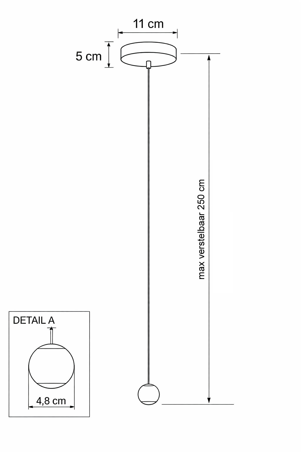De lamp wordt bevestigd aan een compacte plafondplaat met een diameter van 11 cm en hangt aan een snoer met een maximale lengte van 250 cm, waardoor deze geschikt is voor zowel standaard als hogere plafonds.