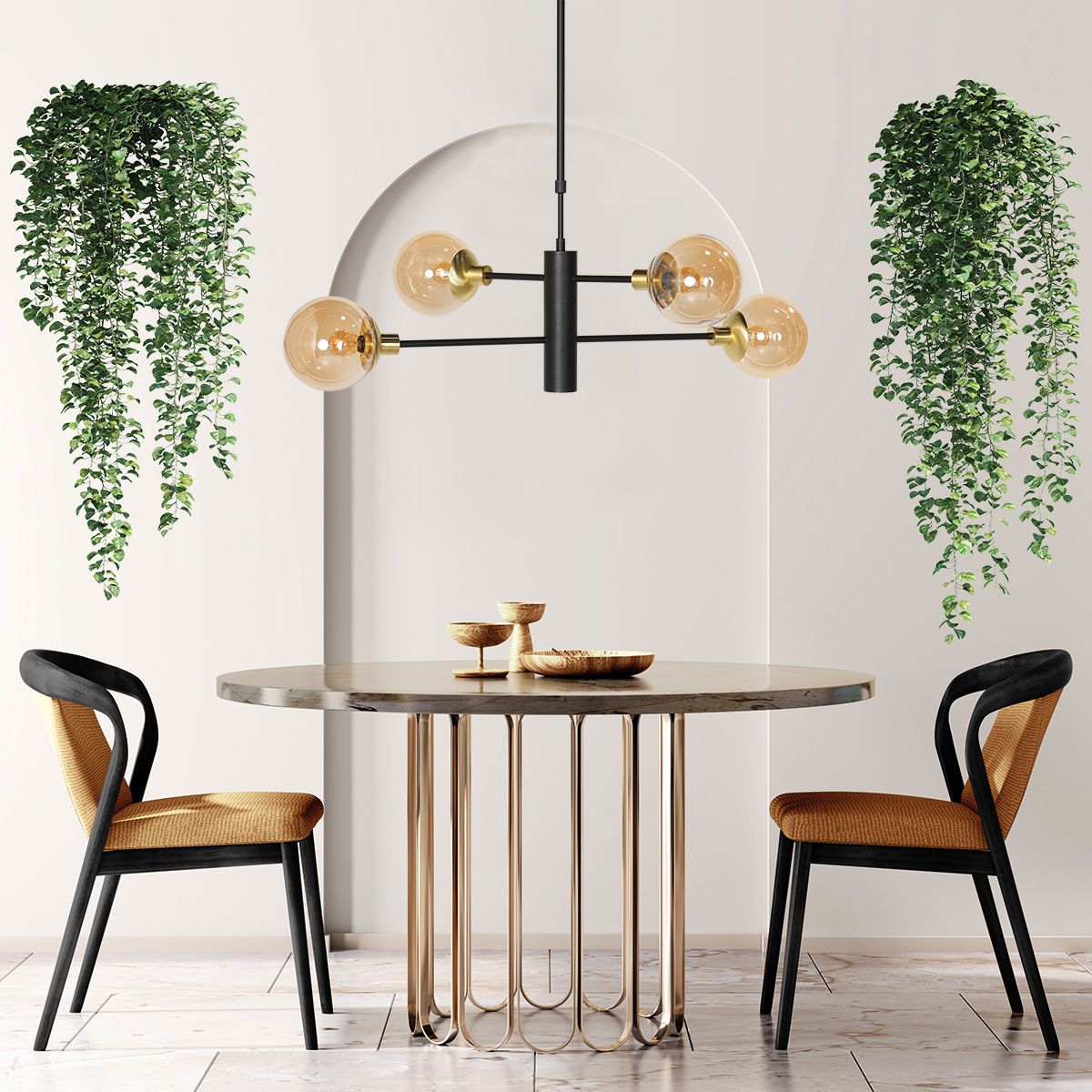 De zwarte hanglamp Constellation met messingkleurige details is een prachtig stuk verlichting dat zeker de aandacht zal trekken. Met zijn vier draaibare armen en glazen amberkleurige bollen voorzien van E14 fittingen, biedt deze lamp een elegante en warme sfeerverlichting. Het onder licht is voorzien van een GU10 fitting.
