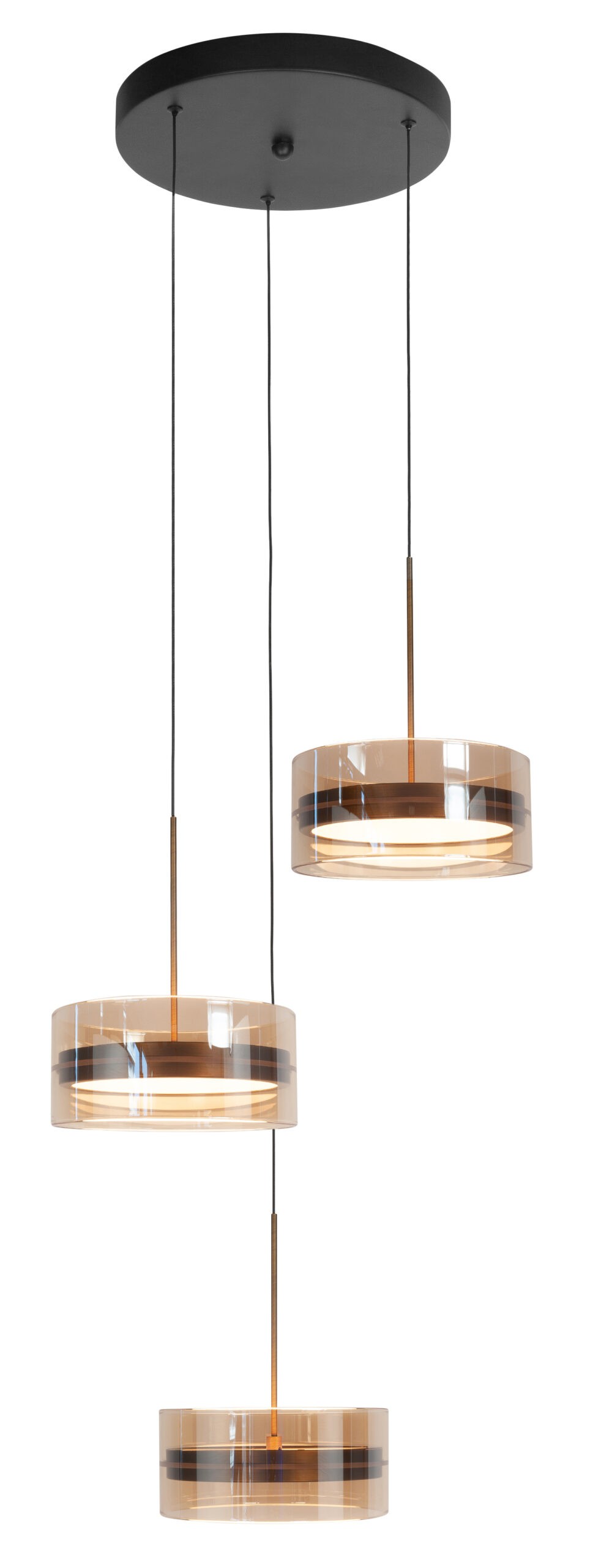 De ronde plafondplaat met een diameter van 30 cm zorgt voor een evenwichtige ophanging van de drie pendels. De maximale hoogte bedraagt 160 cm, maar de snoeren zijn tijdens montage eenvoudig inkortbaar voor de ideale positionering.