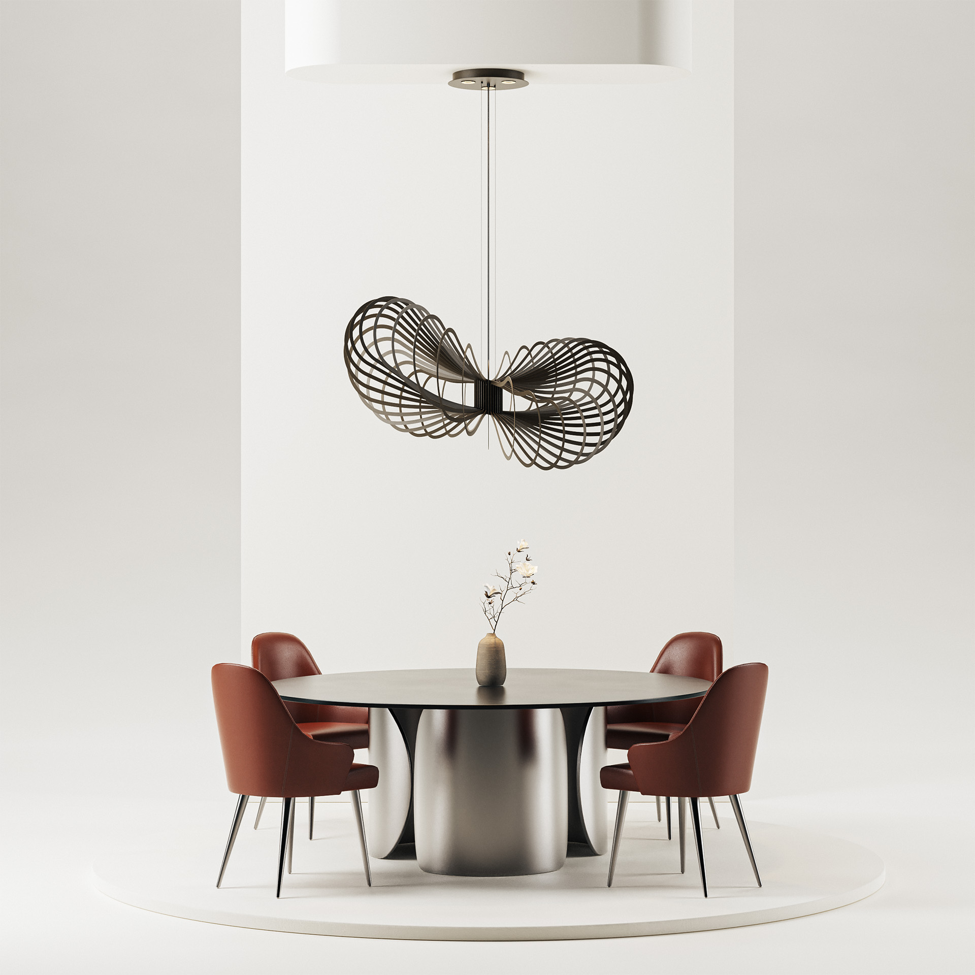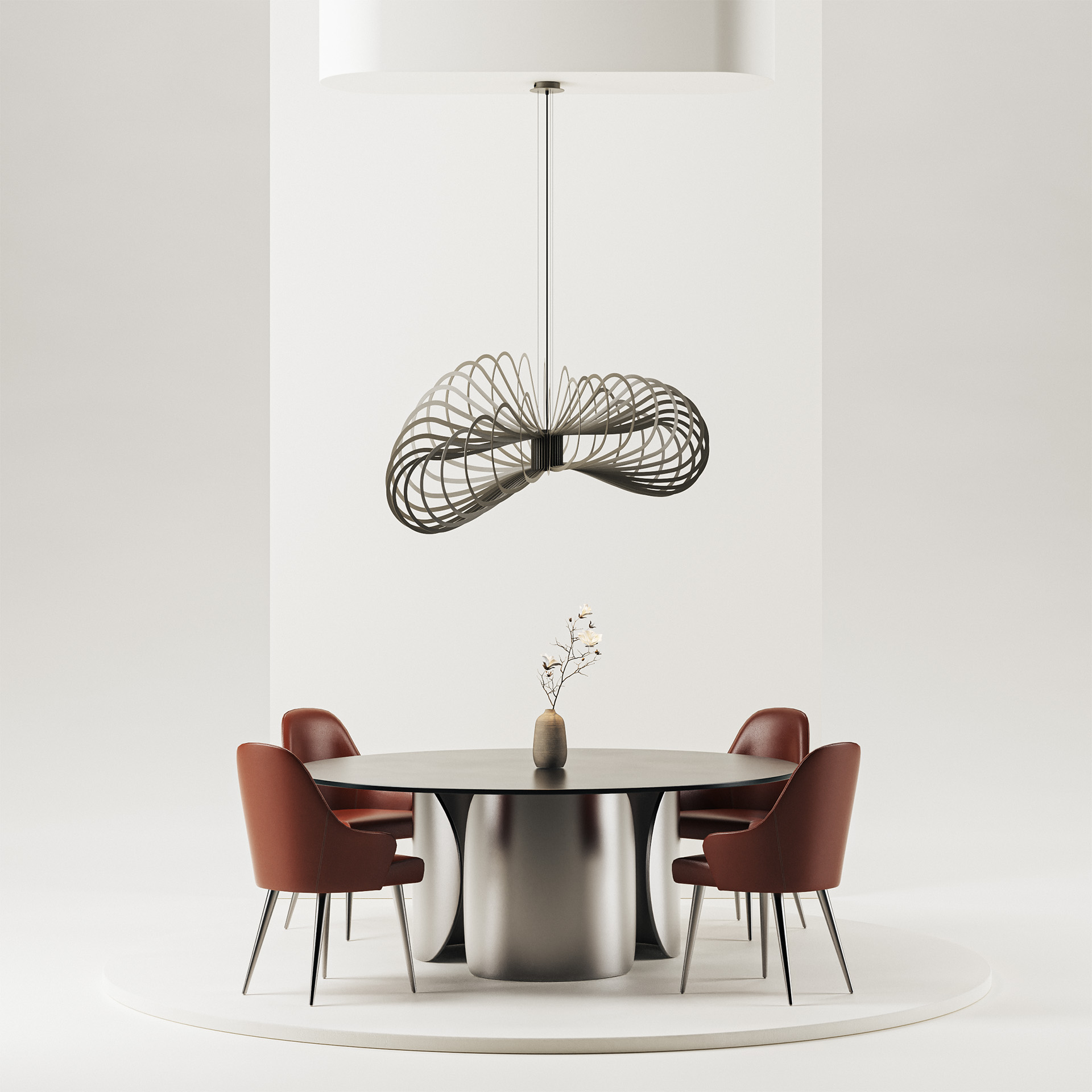 De lamp heeft een diameter van 125 cm en een totale hoogte van 150 cm, die tijdens montage eenvoudig in te korten is. Hierdoor is hij perfect geschikt voor boven een grote eettafel of in een ruime woonkamer.