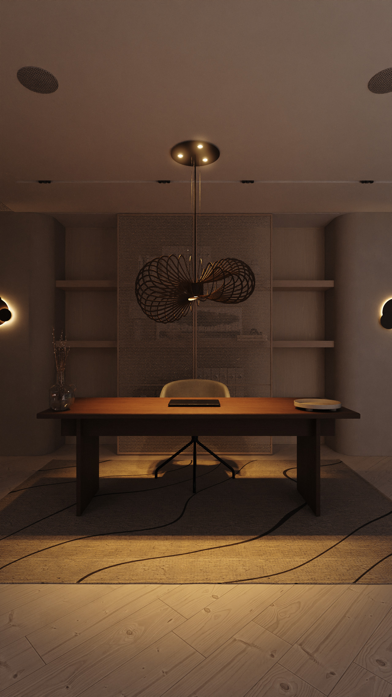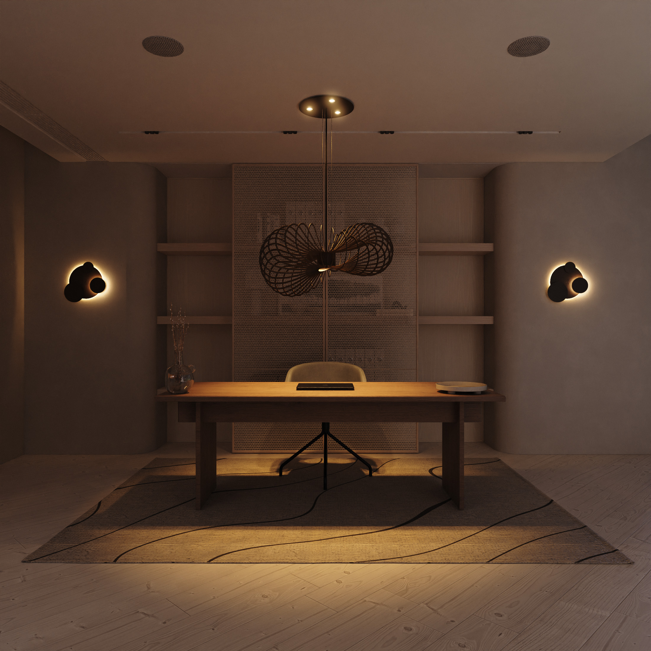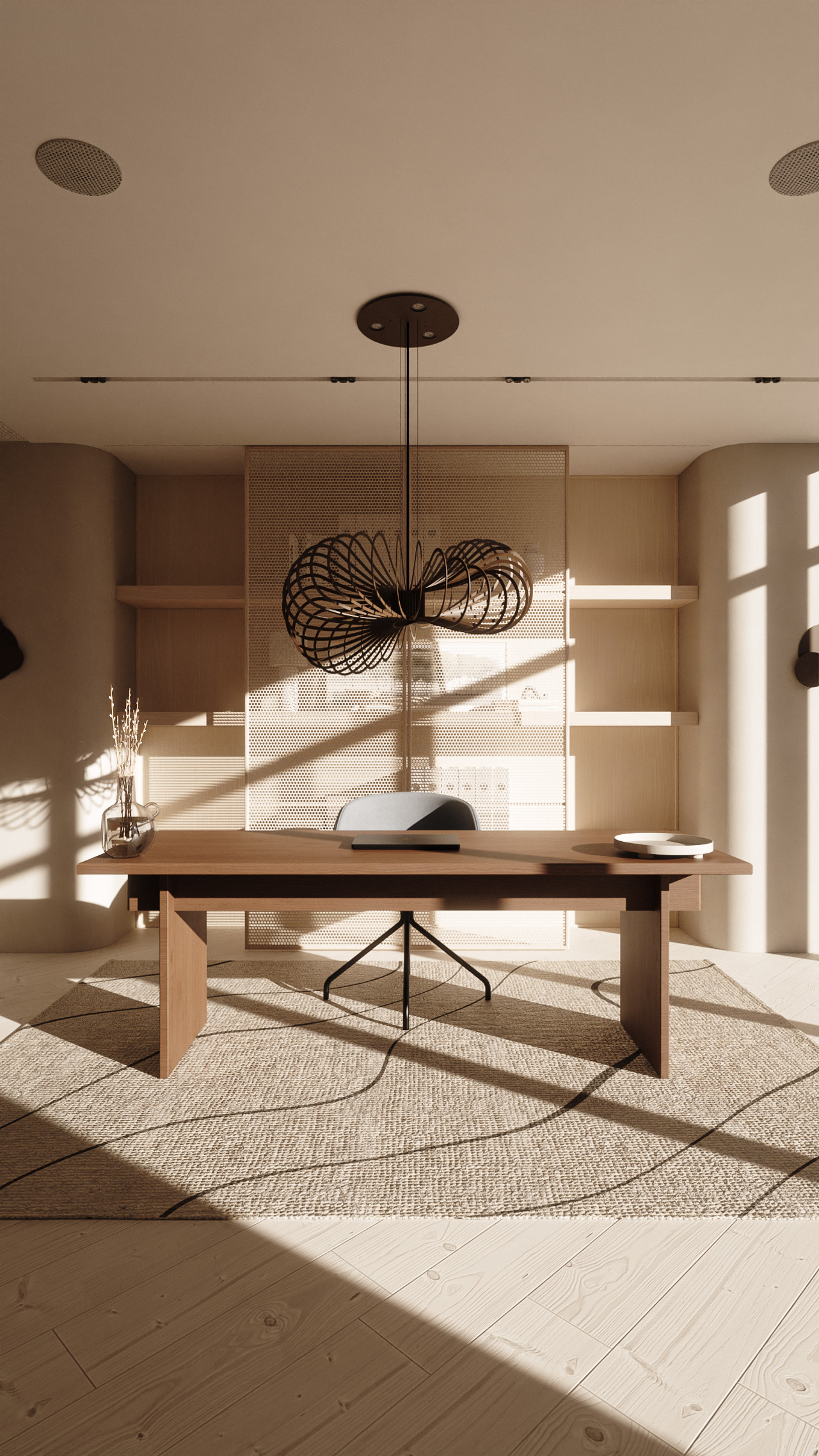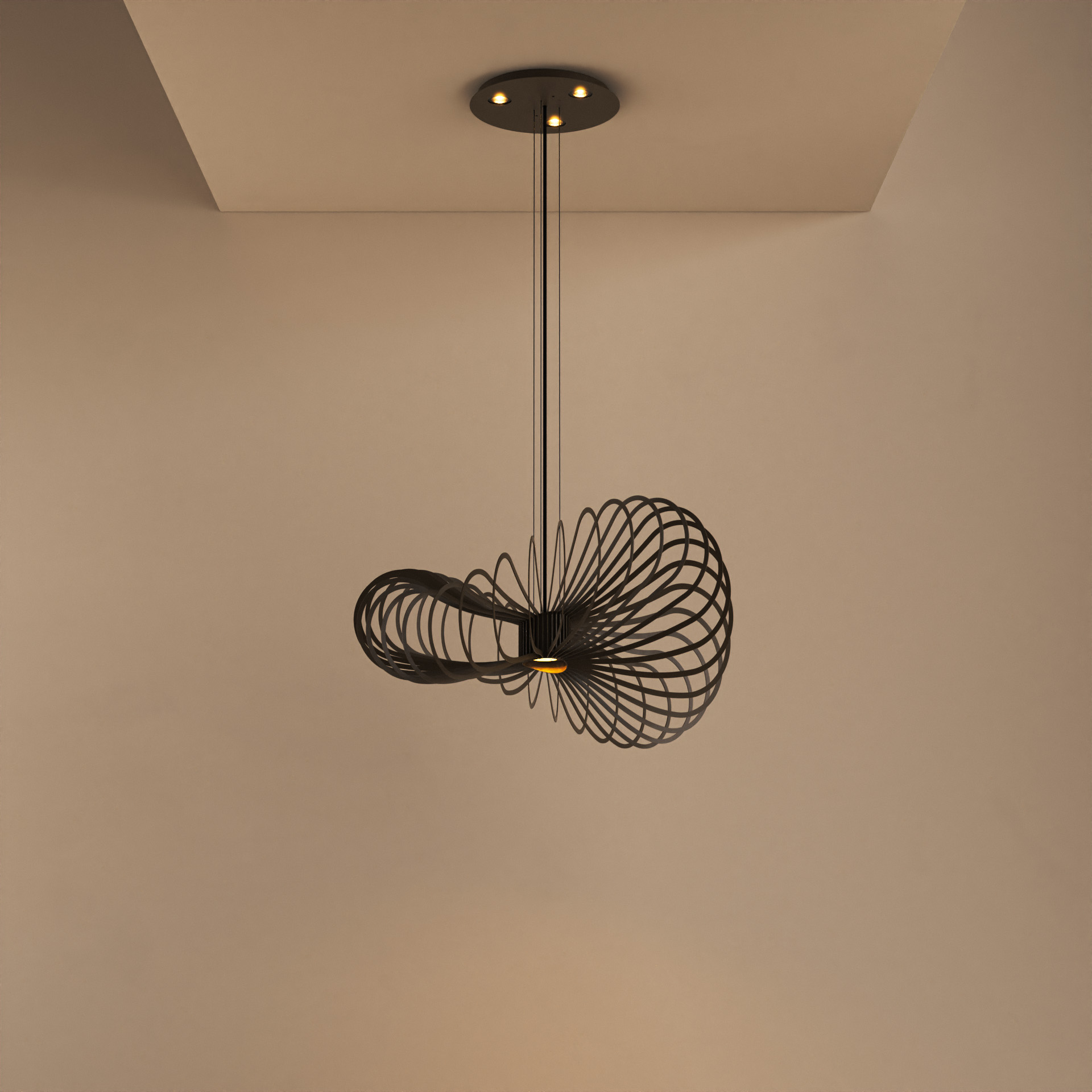 Wat deze lamp extra bijzonder maakt, is de slimme lichtverdeling. In de plafondplaat (Ø 35 cm) bevinden zich 3 geïntegreerde LED-lichtbronnen die naar beneden schijnen. Daarnaast beschikt de lamp zelf over een extra downlighter, waardoor je een mooi en functioneel licht krijgt zonder direct in de lichtbron te kijken.