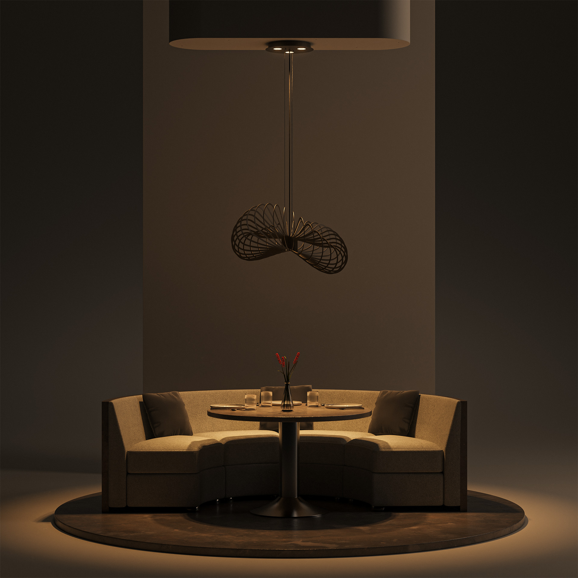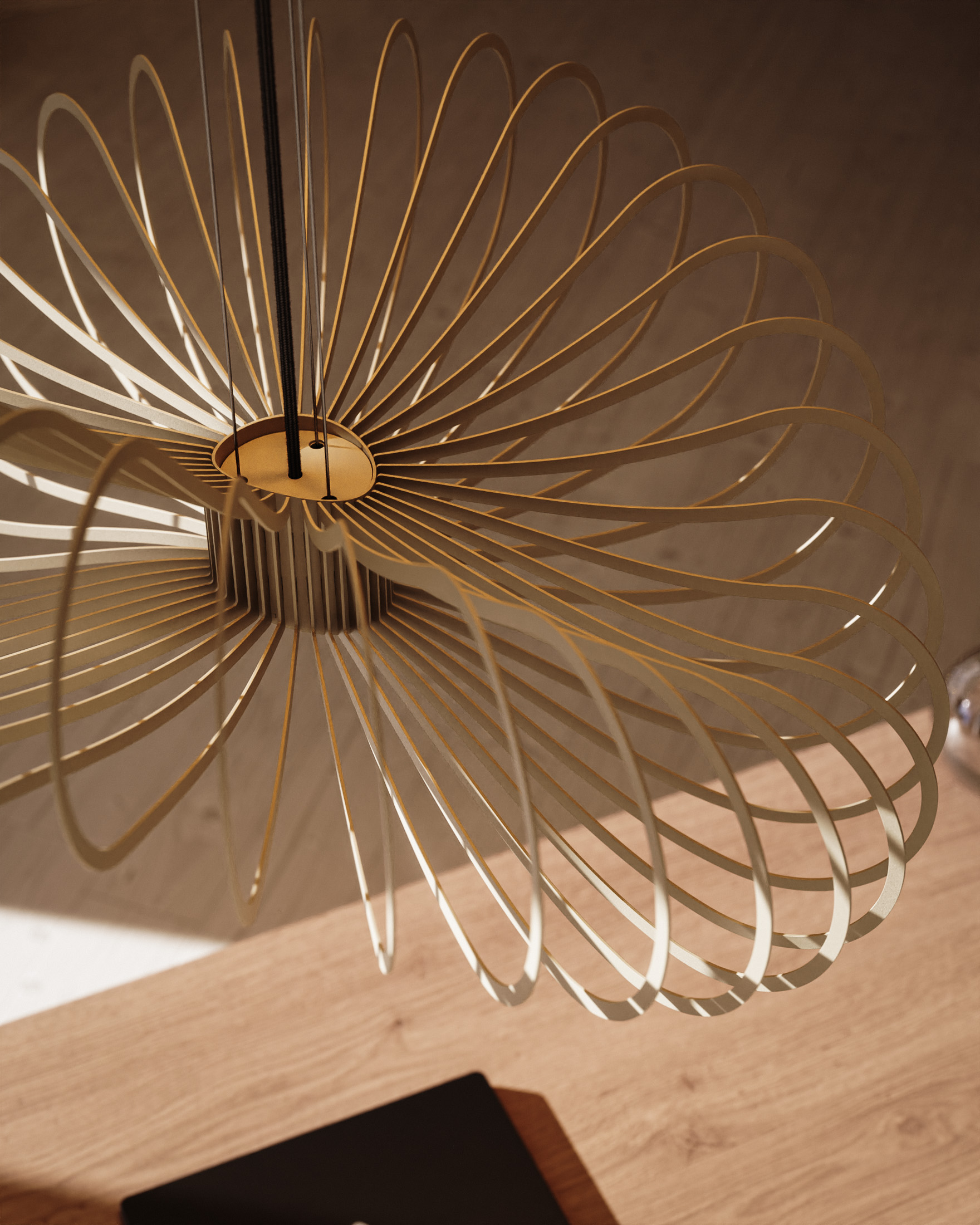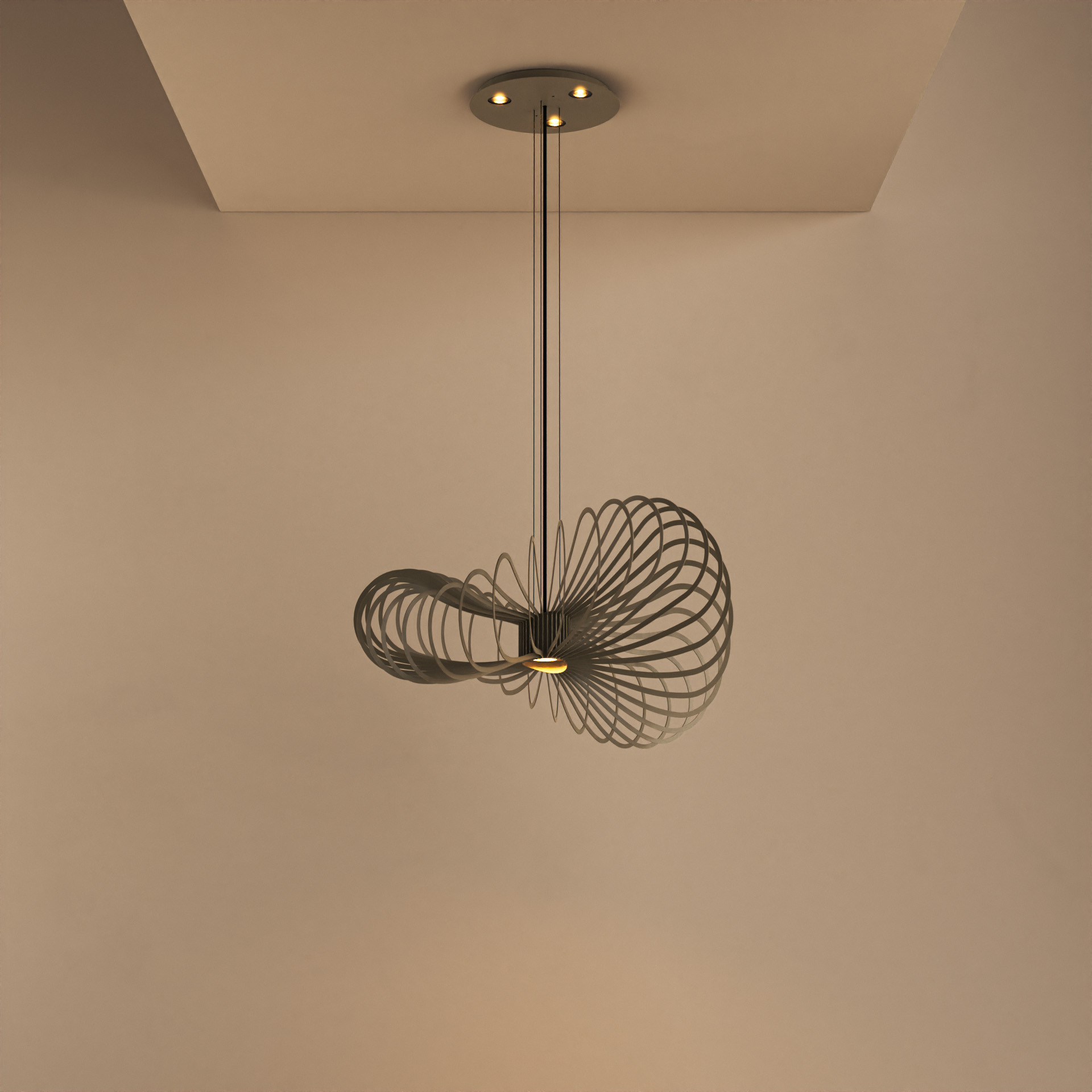 Wat deze lamp extra bijzonder maakt, is de slimme lichtverdeling. In de plafondplaat (Ø 35 cm) bevinden zich 3 geïntegreerde LED-lichtbronnen die naar beneden schijnen. Daarnaast beschikt de lamp zelf over een extra downlighter, waardoor je een mooi en functioneel licht krijgt zonder direct in de lichtbron te kijken.