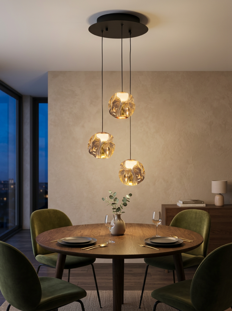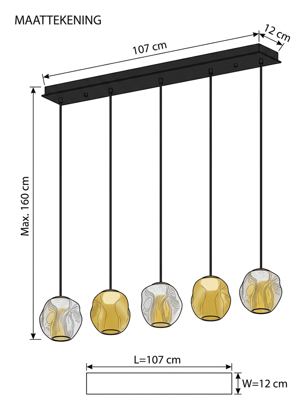 De totale hoogte is 160 cm die uiteraard ingekort kan worden tijdens montage. De diameter van het glas is 11 cm.