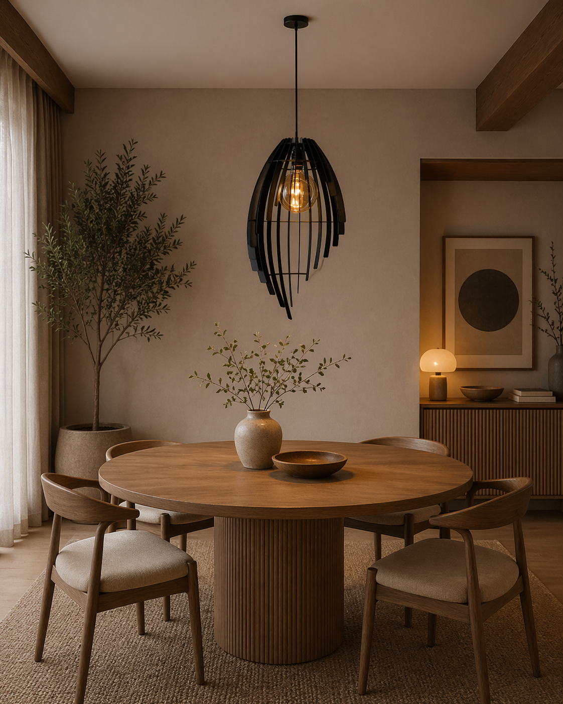 De lamp heeft een hoogte van 55 cm en een diameter van 27 cm, met een totale lengte van 150 cm. Tijdens montage is de lamp eenvoudig in te korten, waardoor hij geschikt is voor verschillende plafondhoogtes en ruimtes zoals boven een eettafel, in de hal of woonkamer.