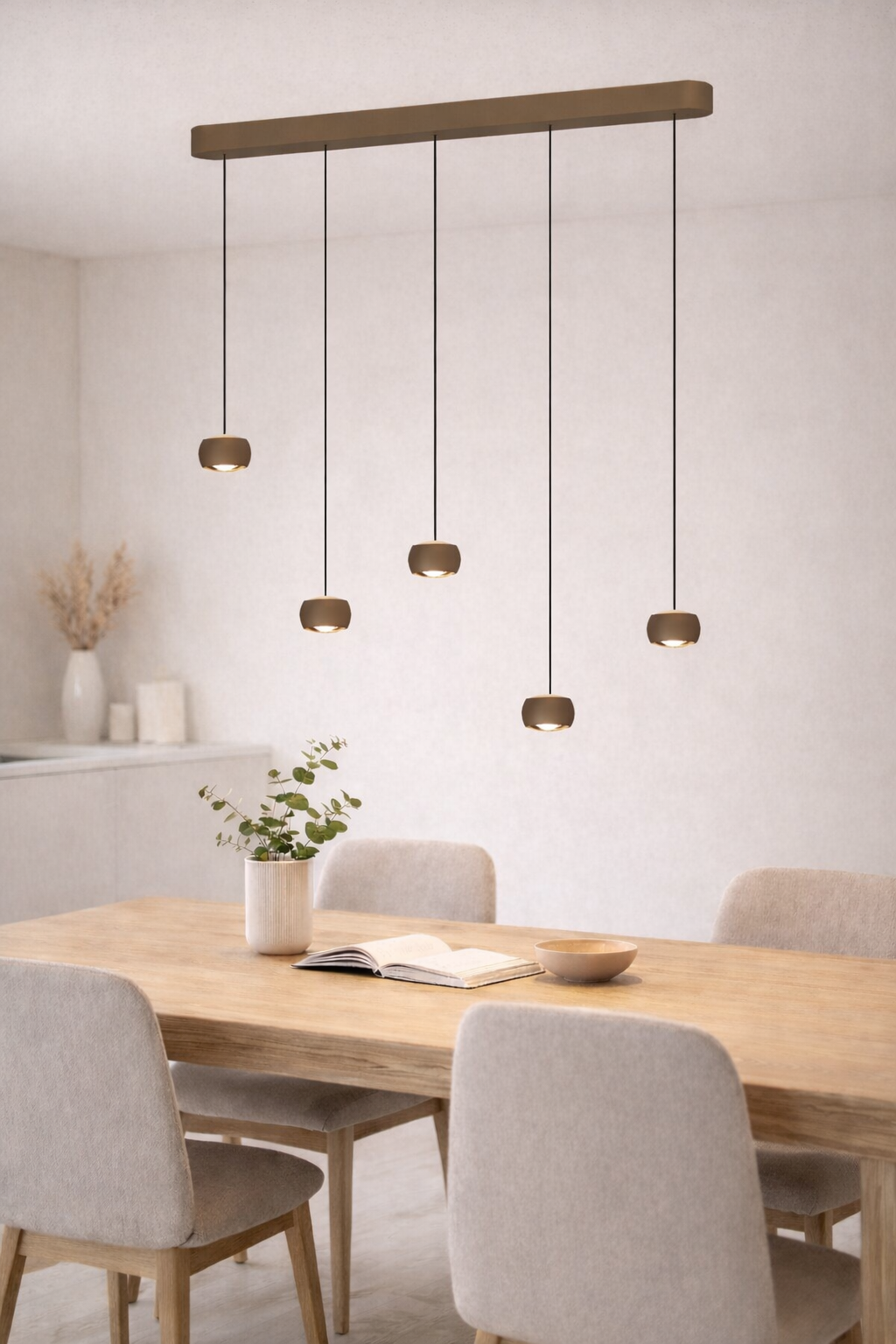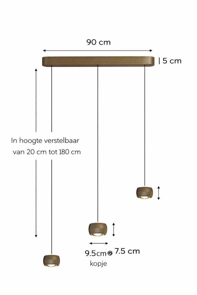Stijlvolle Freelight Cosmo hanglamp met vijf lichtpunten en een luxe brons-gouden afwerking. De slanke balk van 120 cm geeft de lamp een modern en elegant design, ideaal boven een lange eettafel, kookeiland of vergadertafel. Dankzij het Comfort Lift-systeem stel je de lamp eenvoudig in hoogte van 20 tot 180 cm. De geïntegreerde Dim-to-Warm LED zorgt voor flexibel licht: van warm wit (2700K) tot extra warm sfeerlicht (2200K).