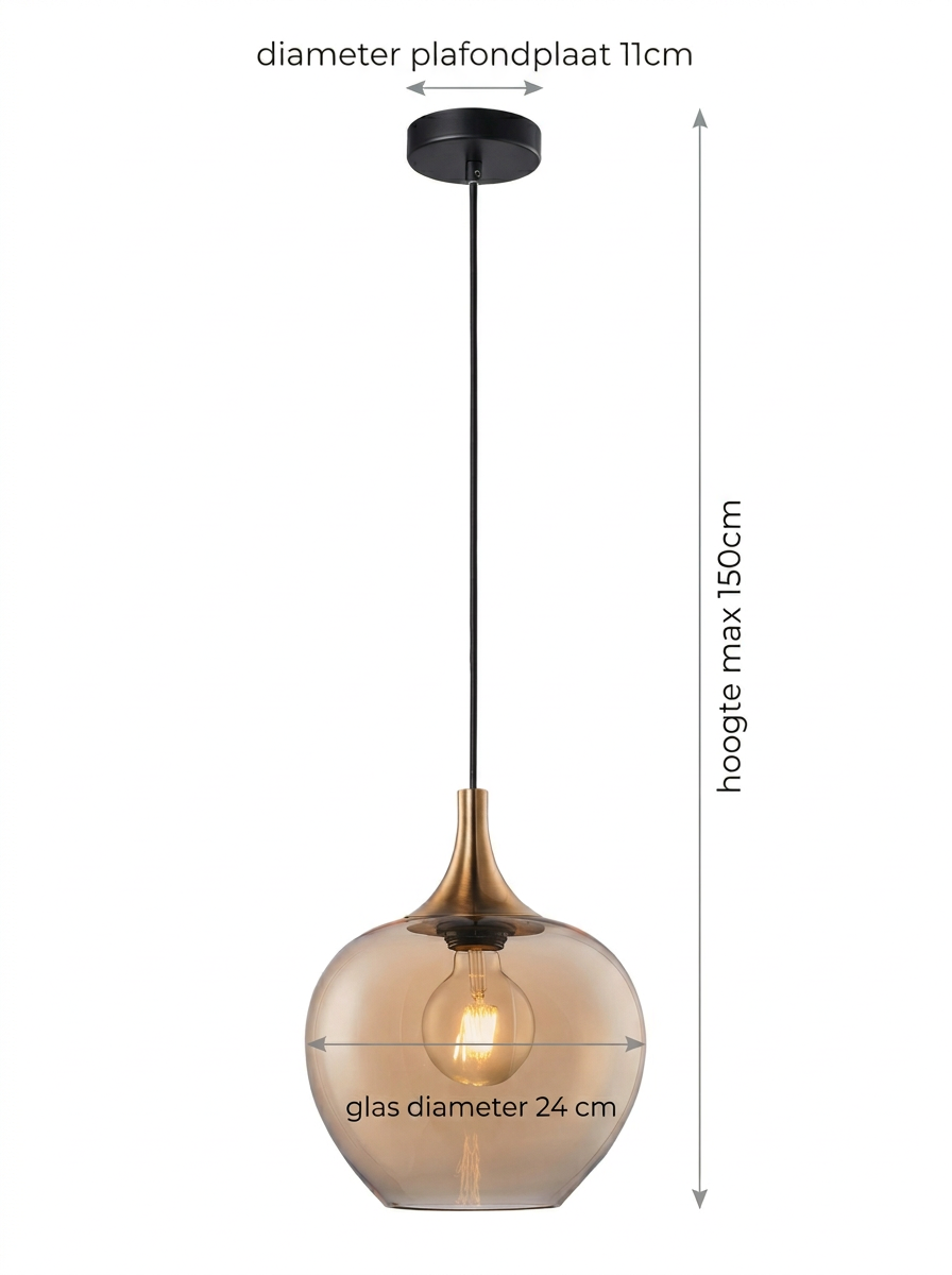 De glazen kap heeft een diameter van 24 cm en verspreidt het licht op een zachte, warme manier die zorgt voor een gezellige ambiance. Met een maximale lengte van 150 cm kan de lamp eenvoudig in hoogte worden aangepast, waardoor ze ideaal is voor plaatsing boven een eettafel, kookeiland, bijzettafel of in een hal.
