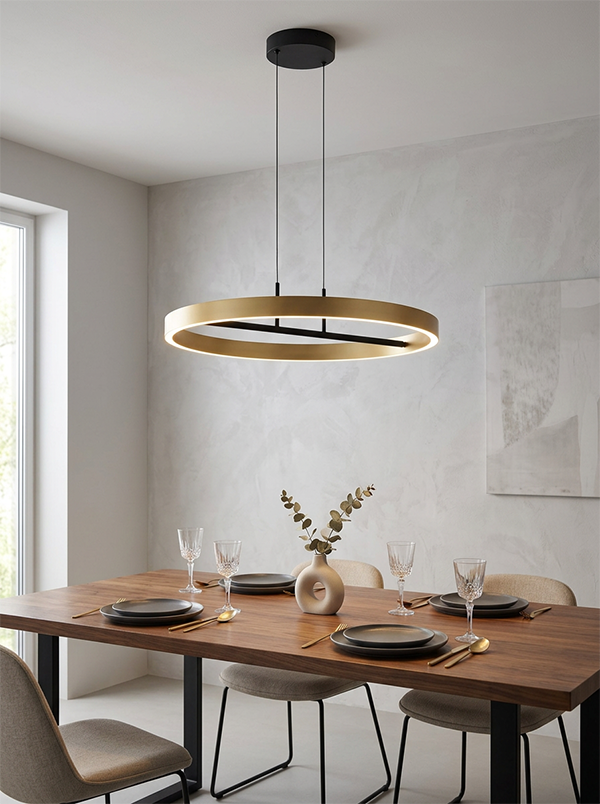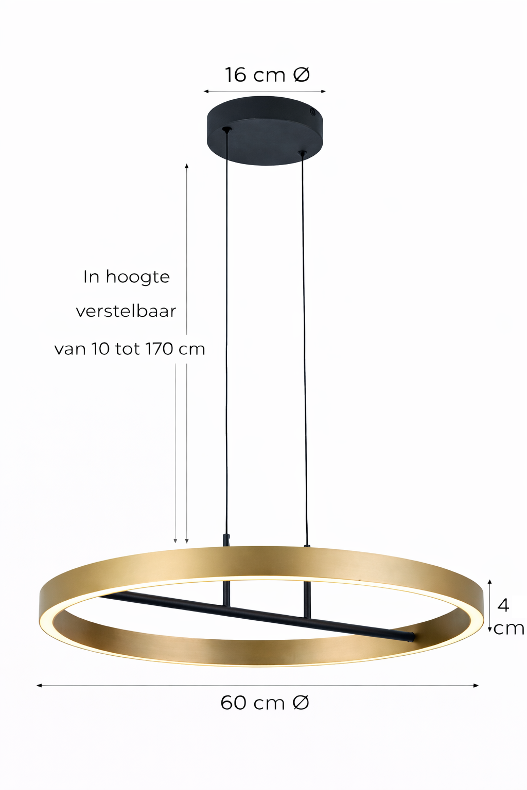 De Freelight Livello hanglamp Ø 60 cm in zwart met gouden ring is een opvallende designlamp met een luxe en moderne uitstraling. De combinatie van een zwarte ophanging en een matgouden ring zorgt voor een stijlvol contrast dat perfect past in moderne, industriële en hotel chique interieurs. De ring kan recht of licht schuin worden opgehangen, waardoor je een speels en dynamisch effect creëert boven de eettafel, het kookeiland of in een open woonruimte.