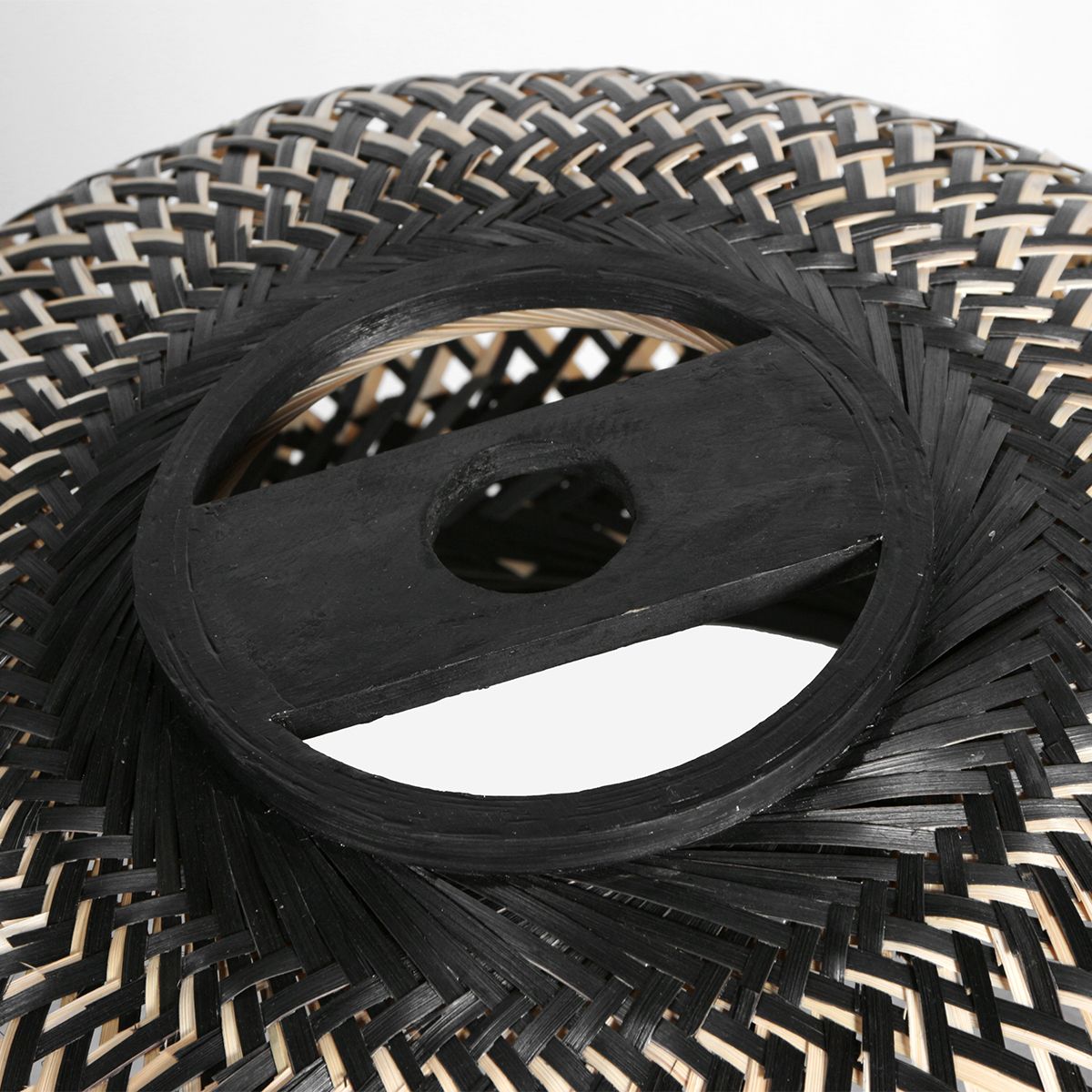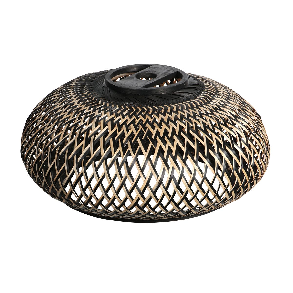 De K2007BS is een opvallende, handgemaakte lampenkap die direct sfeer en karakter toevoegt aan je interieur. Met een royale diameter van 50 cm en een hoogte van 22 cm is deze kap een echte blikvanger boven de eettafel, in de woonkamer of in een open ruimte. De kap is vakkundig gevlochten van zwart bamboe, waarbij de natuurlijke kleur van het blanke bamboe subtiel is verwerkt in het patroon voor een speels en warm contrast.