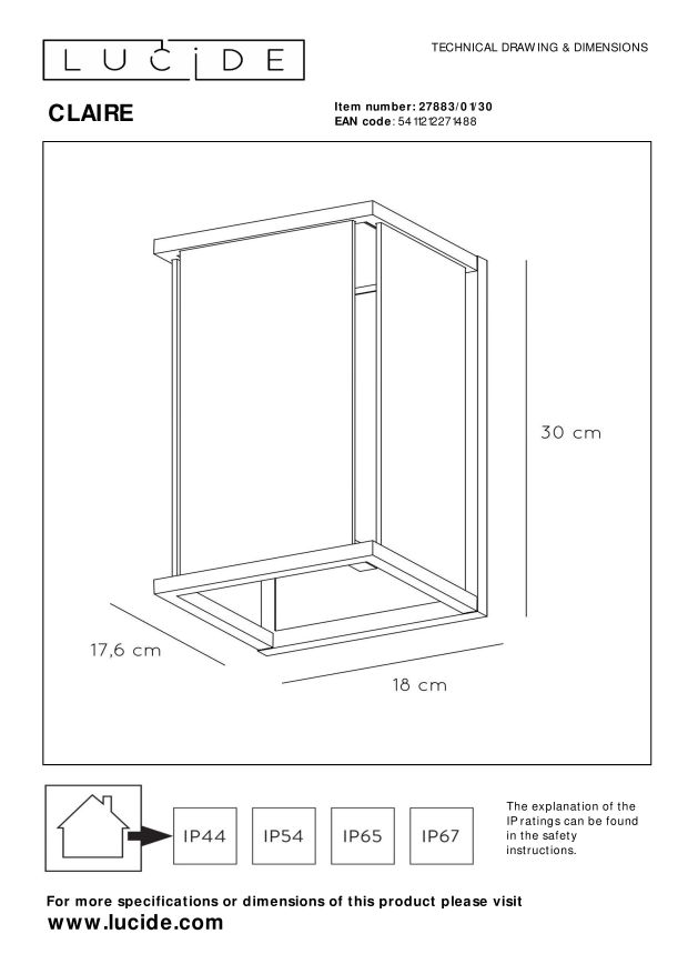 Claire is een elegante verlichting. De lichtbron zit beschermd achter doorschijnend glas. Met een lengte van 17,5 centimeter en een hoogte van 30 centimeter loopt Claire niet in de weg. Dankzij de E27-fitting in combinatie met een IP-waarde van 54 scoort deze wandlamp hoog op functionaliteit. Zeker ook op je terras. Sluit haar aan op led-verlichting en ze zorgt met veel gevoel voor een mooie verlichting terwijl je geniet van een gezellige avond met het gezin. Met haar warmte verwelkomt Claire elke gast met open armen.