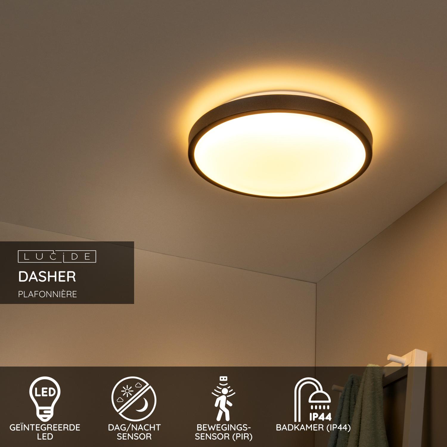 Lucide DASHER – Plafonnière Badkamer – Ø 41 cm – LED – 1x24W 2700K – IP44 – Beweging & dag/nacht sensor – Zwart