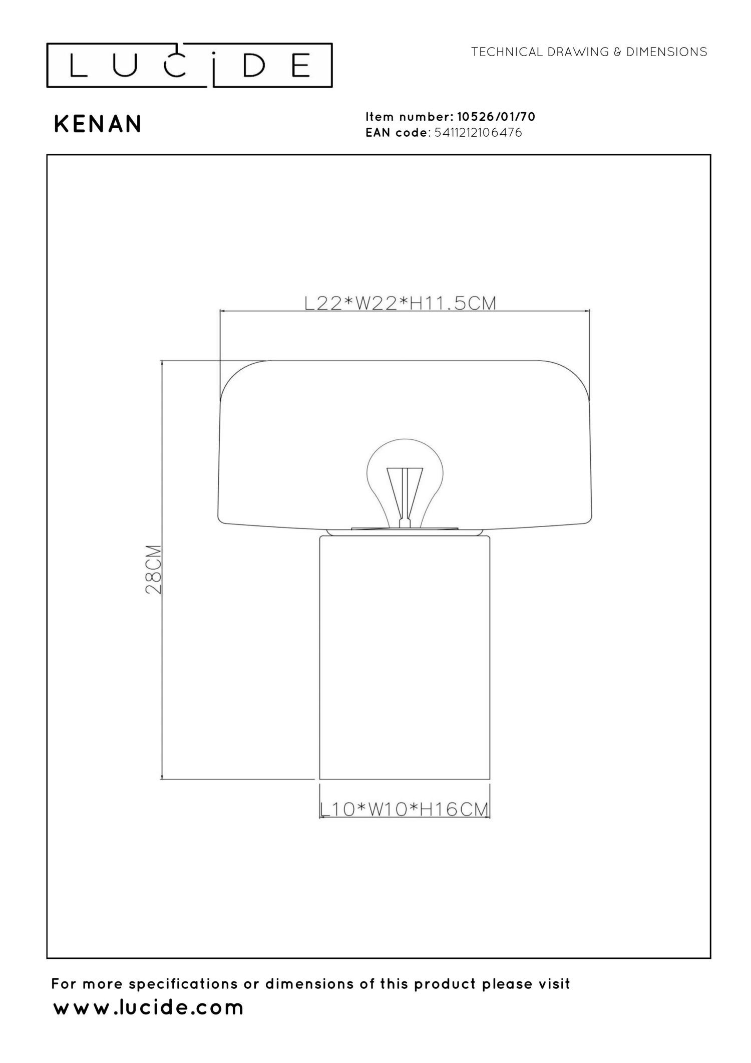 Gezelligheid troef met Kenan aan je zijde. Deze elegante schemerlamp heeft een houten cilindervormige voet en ronde kap in melkglas. Kenan voelt zich zowat overal thuis: als accessoire op je wandkast, als sfeermaker in de hal of als compagnon op je nachtkastje. Of plaats de lamp op een lage salontafel naast een zetel voor aangenaam indirect licht. De tafellamp is 22 centimeter breed en 28 centimeter hoog. Kenan knip je makkelijk aan en uit met de schakelaar op het snoer.