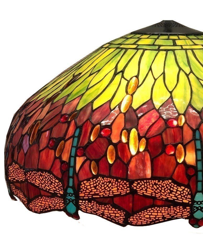 Met de hand vervaardigd en gemaakt van hoogwaardige materialen, is de Tiffany Kap ⌀60cm Dragonfly summer een waar kunstwerk dat een vleugje klasse en erfgoed toevoegt aan elk interieur. Het kenmerkende gebruik van gekleurd glas resulteert in een verbluffend patroon van zomerse libellen, dat zowel functionele verlichting als decoratieve kunst biedt.