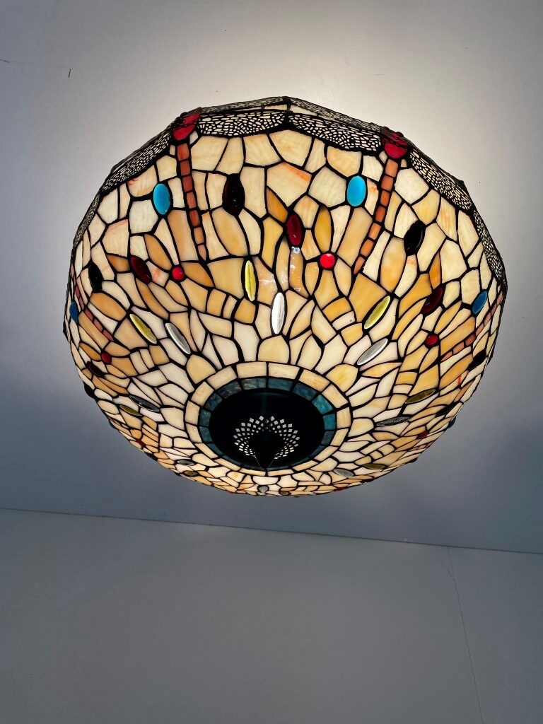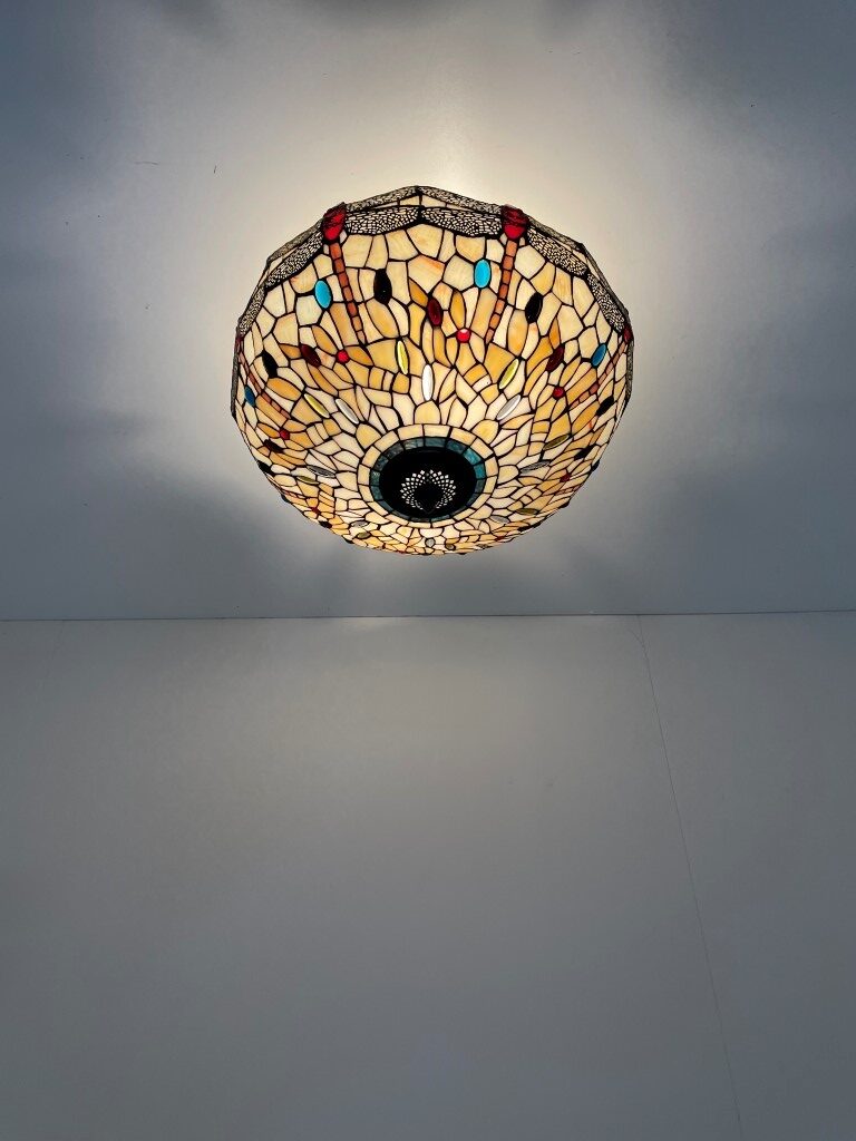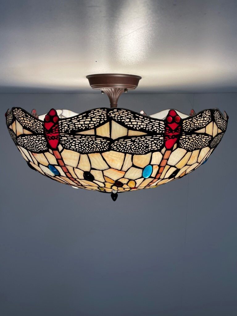 - De diameter van deze imposante Tiffany plafondlamp Dragonfly is 55 cm, terwijl de hoogte 35 cm bedraagt.