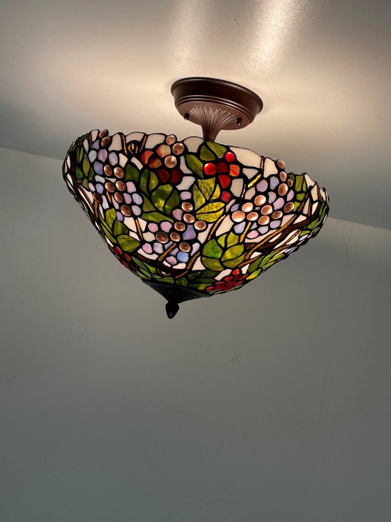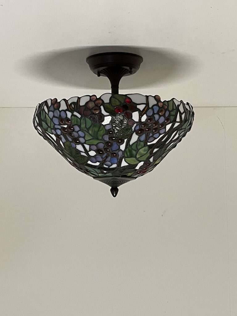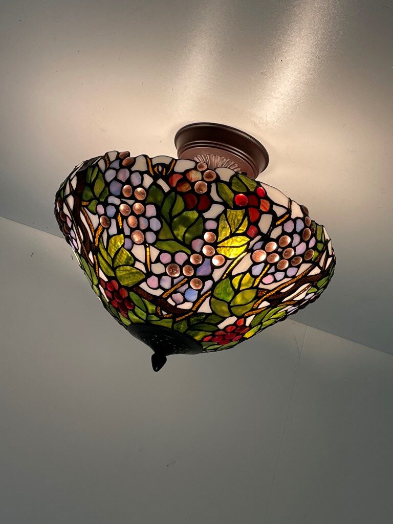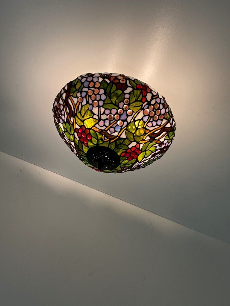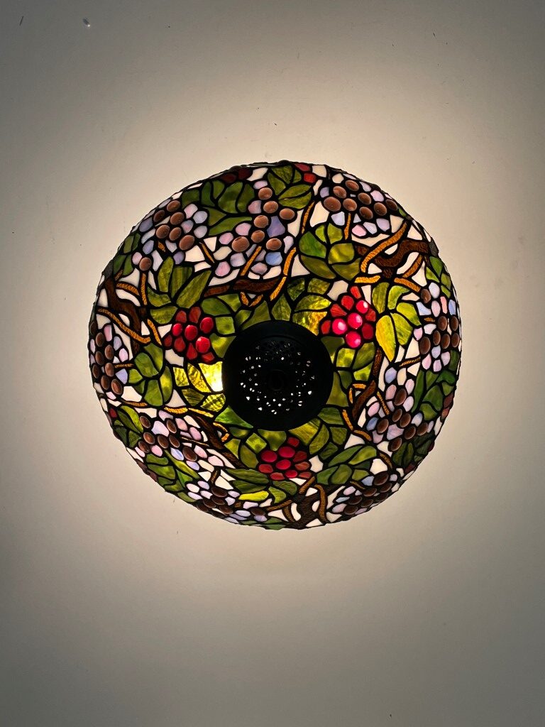Met de Tiffany plafondlamp Gibraltar Flow haal je een echt kunstwerk in huis. Deze lamp is handgemaakt en bestaat uit maar liefst 729 stukjes glas die op ambachtelijke wijze zijn geassembleerd en gesoldeerd. Het resultaat is een uniek en kleurrijk patroon met prachtige druiven.