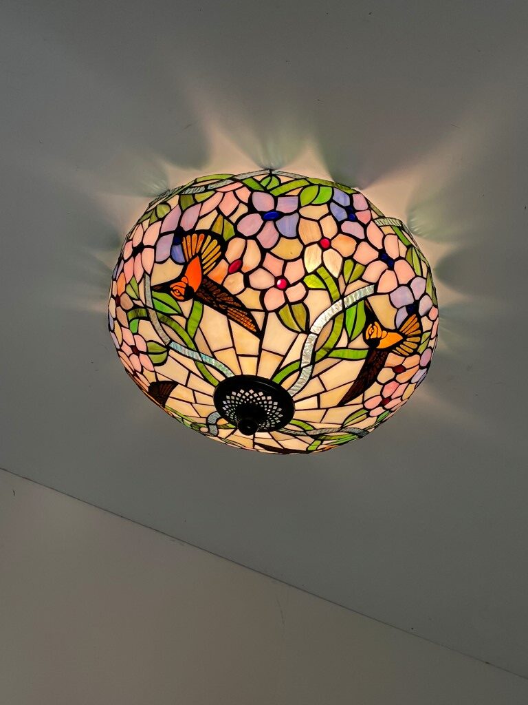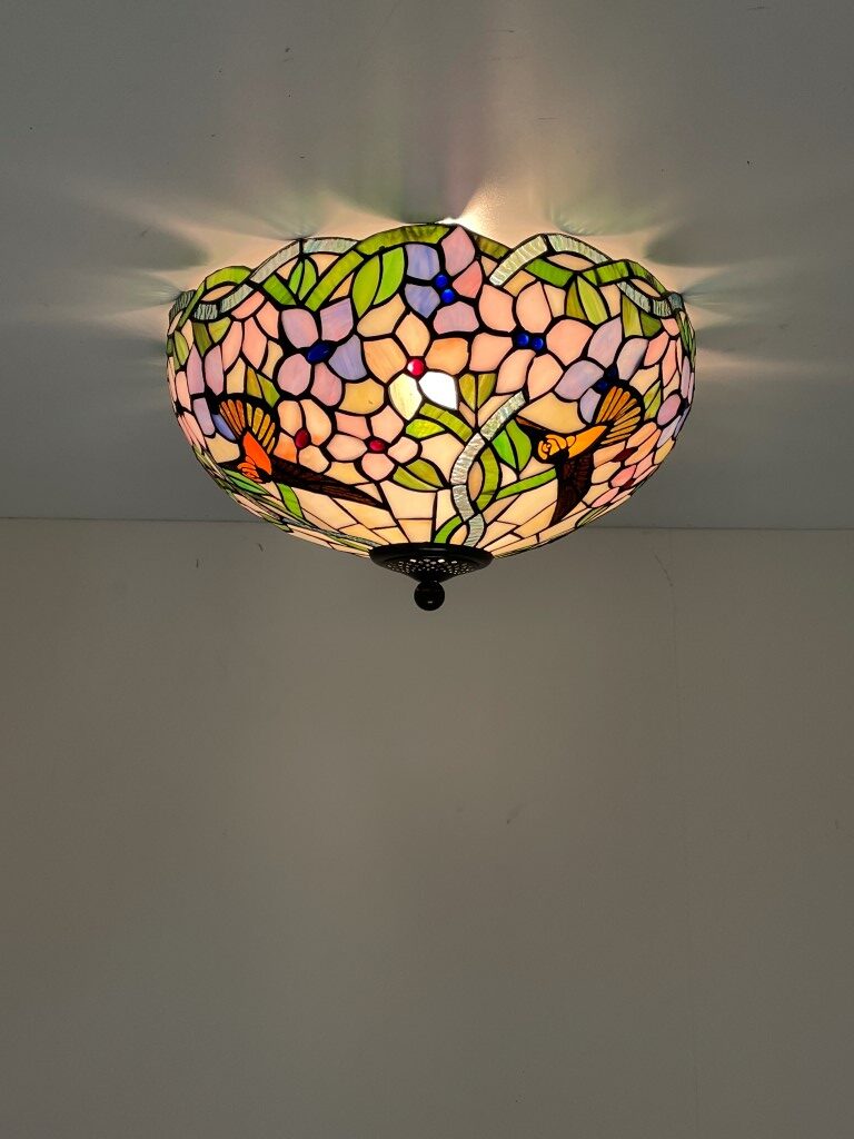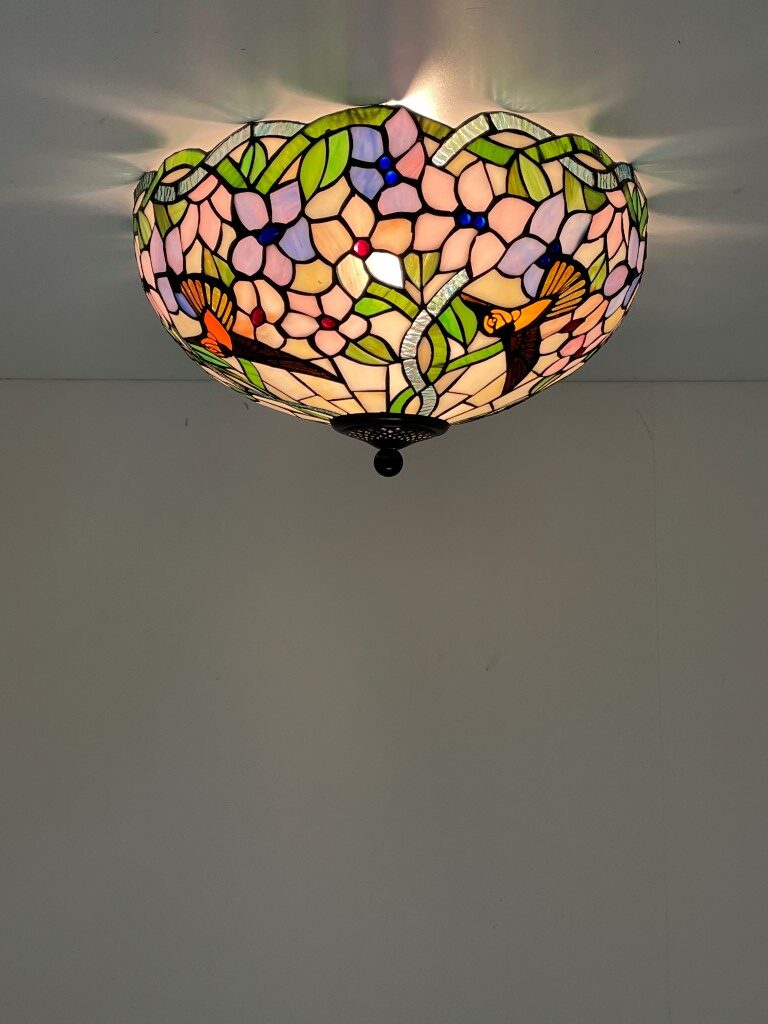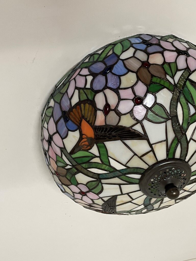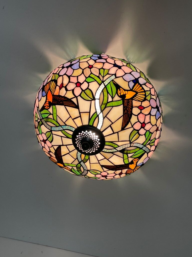 De Tiffany plafondlamp Hummingbird 40 – 80 is een ware blikvanger in elke ruimte. Met zijn prachtige bloemmotieven en levendige kleuren voegt hij niet alleen functionele verlichting toe, maar ook een vleugje kunst en ambiance aan je interieur. Deze lamp is met de hand vervaardigd, waarbij elk stuk zorgvuldig geassembleerd en gesoldeerd is. Dit resulteert in unieke ambachtelijke stukken die je interieur naar een hoger niveau tillen.