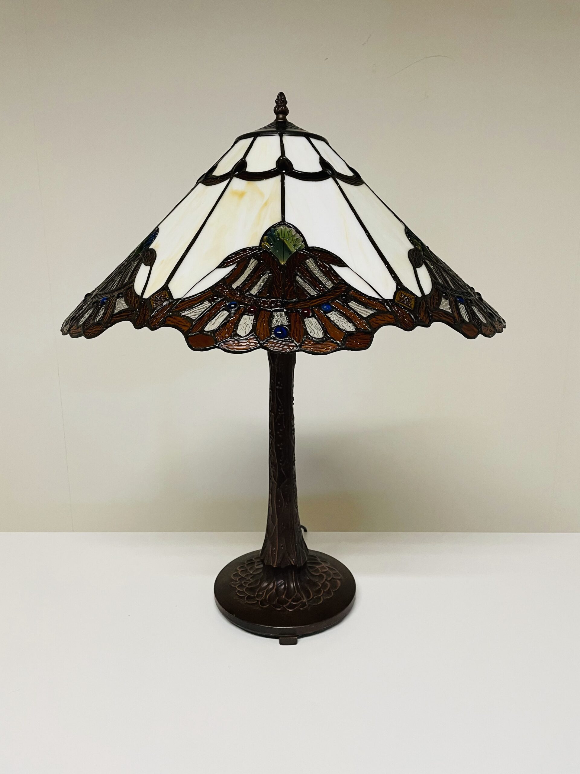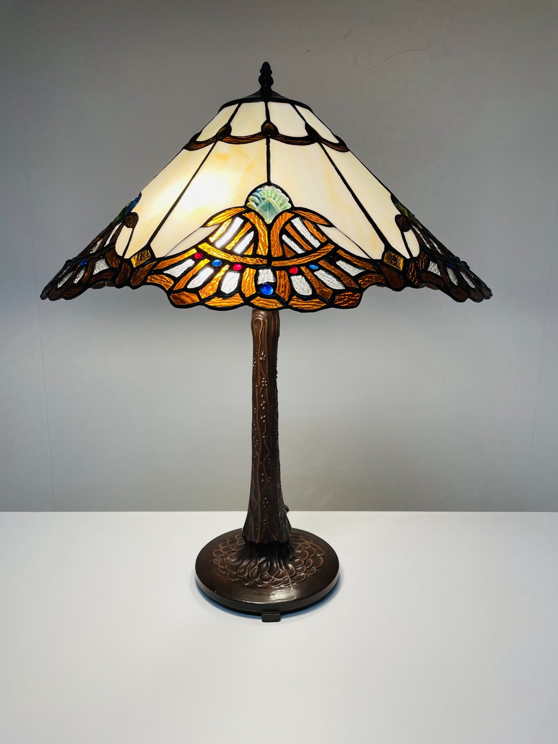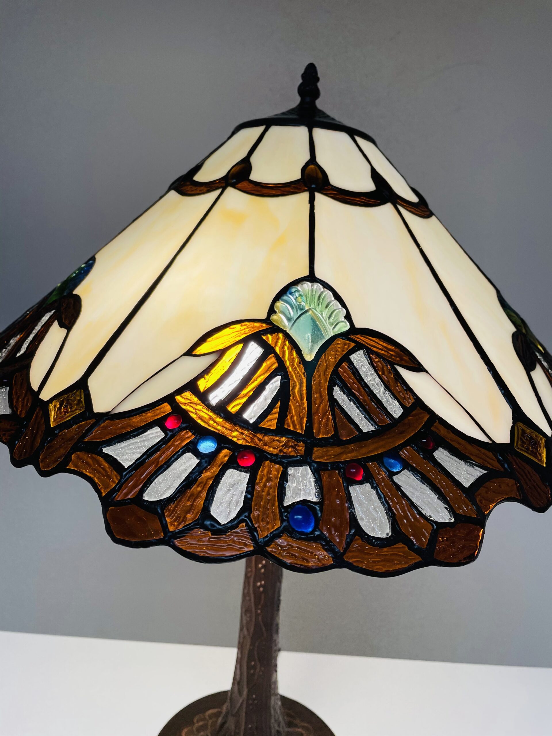 De Tiffany tafellamp Ø 50cm Elba P1 is een zeer geslaagde combinatie van een prachtig bewerkte klassieke voet en een schitterende glazen kap. Met de hand als echt ambachtswerk vervaardigd, is elke lamp uniek en draagt bij aan de artistieke schoonheid en esthetische waarde van je interieur.