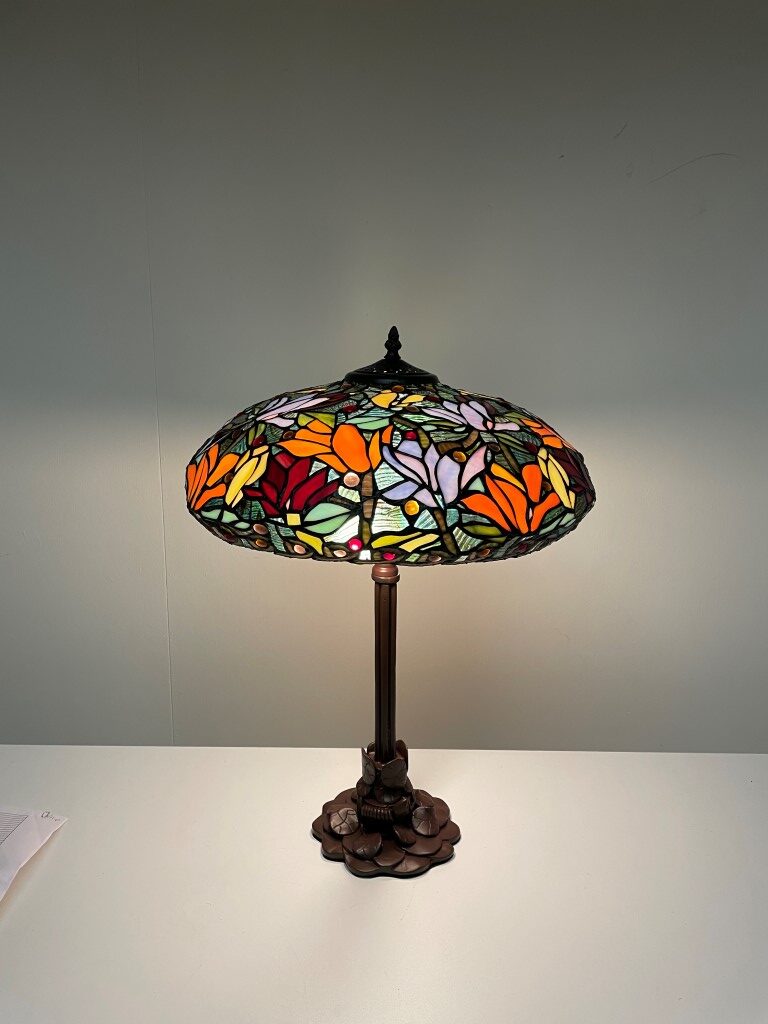 Het kenmerkende gebruik van gekleurd glas zorgt voor verbluffende patronen en kleurschakeringen. Het verspreidt een zacht en diffuus licht, waardoor een warme en gezellige sfeer ontstaat. Of je nu de lamp plaatst in de woonkamer, slaapkamer of op kantoor, het voegt kleurrijke en artistieke schoonheid toe aan elke ruimte.