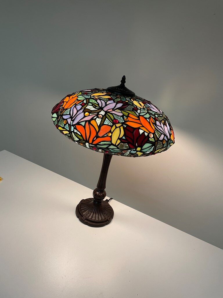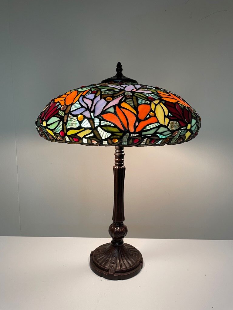 Maak kennis met de Tiffany tafellamp San Marino 40 – P7, een imposante toevoeging aan je interieur. Met zijn hoogte van 58 cm en een kapdiameter van 40 cm trekt deze lamp onmiddellijk de aandacht. De elegante vormgeving en het gebruik van gekleurd glas zorgen voor verbluffende patronen en kleurschakeringen die je ruimte opvrolijken en een warme sfeer creëren.