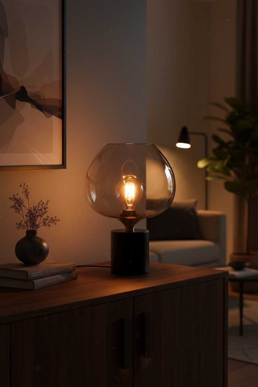 De Fresu tafellamp heeft een totale hoogte van 38 cm en een diameter van 24 cm. Dankzij het lange snoer van 160 cm kan de lamp flexibel worden geplaatst op een dressoir, bijzettafel of nachtkastje. De warme gloed van het amberkleurige glas zorgt voor een gezellige, uitnodigende sfeer — ideaal voor woonkamer, slaapkamer of hal.