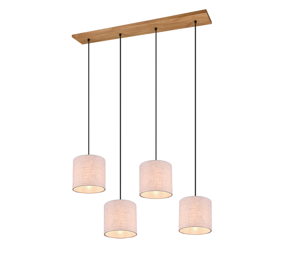 Natuurlijke materialen, zoals hout en stof, werken uitnodigend en creëren een behaaglijke sfeer. De lampen van de serie ELMAU brengen een gezellige charme en een aangename lichtstemming uw huis binnen. Op de gang of in de woon- of slaapkamer, die lamp biedt veelzijdige toepassingsgebieden. De viervlammige hanglamp heeft een maximale hanglengte van 150 cm. De aparte lampenkappen hebben een diameter van 35 cm en de hoogte ervan kan individueel afgesteld worden. Het lichte design uit hout en beige stof laat zich gemakkelijk combineren met verschillende kleur- en inrichtingsconcepten. Voor een energiebesparende verlichting is het gebruik van een ledlichtbron aanbevolen. Deze zijn een optimaal alternatief voor gewone halogeenlampen en staan voor een hoge lichtkwaliteit en een energiebesparing van tot 80%. Bovendien profiteert u bij ledlichtbronnen van een lange levensduur, een geringe warmteontwikkeling en spaart tegelijkertijd het milieu.