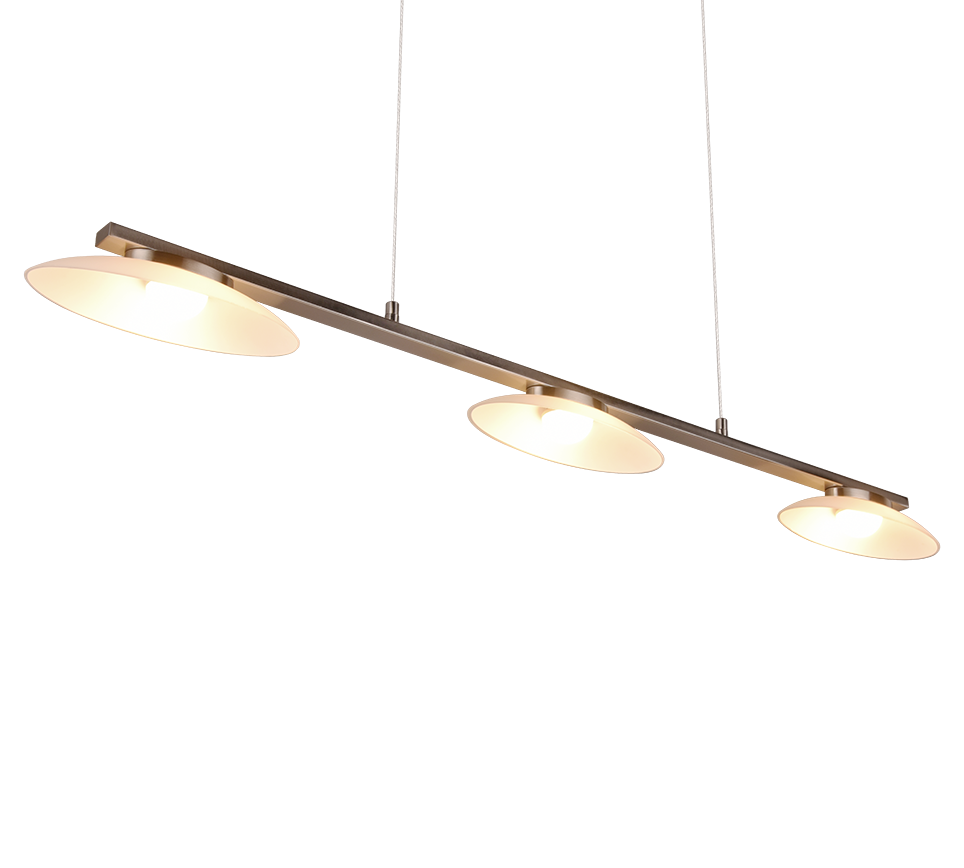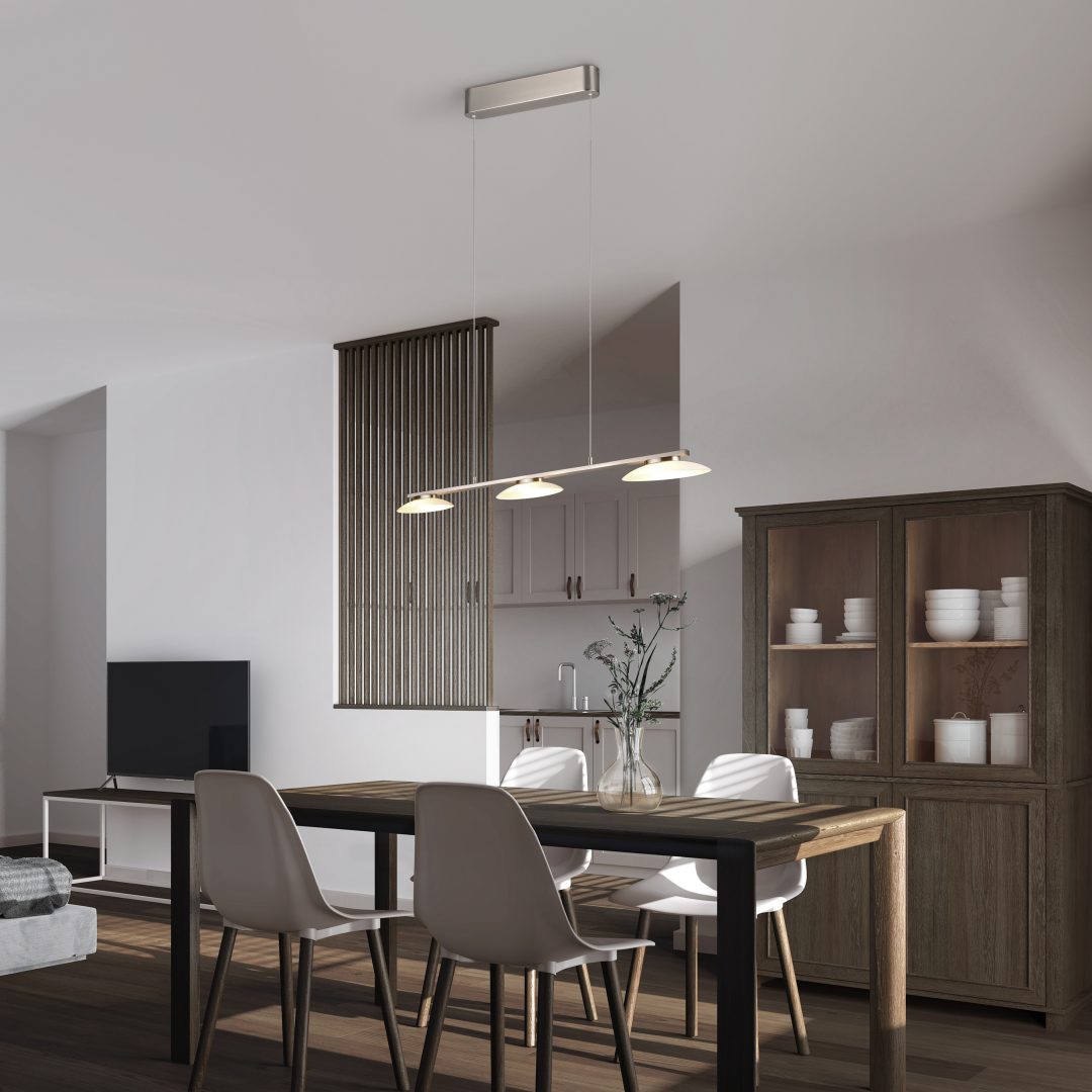 Nikkelkleurige lampen met glas kunnen op verschillende manieren worden gebruikt en geven blijk van een geraffineerde touch – net als de minimalistische, tijdloze MERTON hanglamp. De drie glazen elementen verspreiden het licht zachtjes in hun omgeving, waardoor de armatuur een geschikte lichtbron is boven een eettafel of aanrecht. Met de geïntegreerde SWITCH-dimmer kan de lichtsterkte bovendien in drie stappen (100%, 50%, 25%) worden aangepast met een conventionele lichtschakelaar. Laat je eettafel stralen als centraal element in de eethoek! De hanglamp creëert een harmonieus geheel dankzij het witte glas en het metaal in mat nikkel. De armatuur is ook voorzien van moderne LED-technologie, die wordt gekenmerkt door een hoge lichtkwaliteit en energie-efficiëntie. Vergeleken met conventionele halogeenlichtbronnen kan tot 80% op de energiekosten worden bespaard. Met LED lichtbronnen profiteert u ook van een lange levensduur en een lage warmteontwikkeling, terwijl het milieu wordt beschermd.