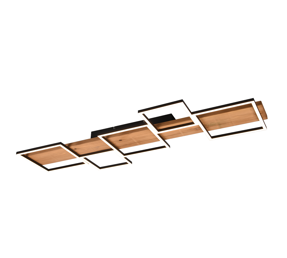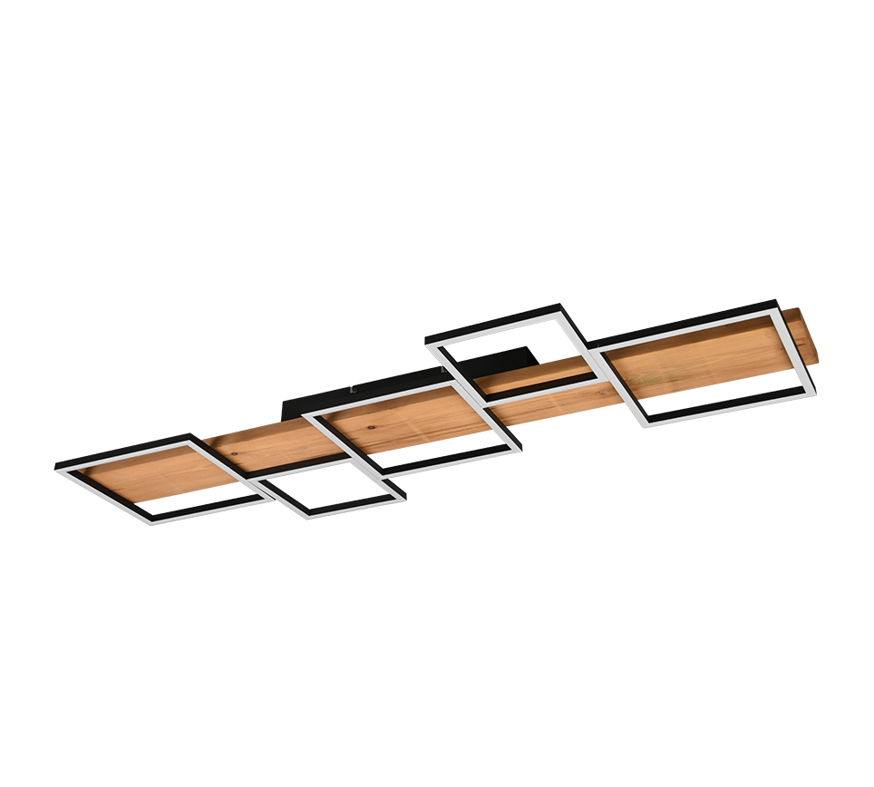 De plafondlamp Harper belooft comfort en elegantie in uw huis dankzij haar moderne design. De combinatie van de materialen hout en metaal onderstreept de elegante woonstijl en zorgt met de vijf vierkante lichtelementen voor een aangename verlichting boven de eettafel. Bovendien heeft de lamp een SWITCH-dimmer en kan zo de helderheid met een conventionele lichtschakelaar worden aangepast van 100% naar 50% en 25%. De lamp wordt in uw woonkamer een echt pronkstuk dankzij het natuurlijke hout en metaal in mat zwart, dat gegarandeerd voor een blikvanger zorgt. Daarnaast beschikt de lamp over een moderne ledtechnologie die zich onderscheidt met een hoge lichtkwaliteit en energie-efficiëntie. In vergelijking met gewone halogeenlampen kan tot 80% bespaard worden op de energiekosten. Bovendien hebben ledlampen een lange levensduur, produceren minder warmte en zijn milieuvriendelijk.