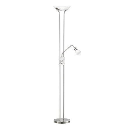 De trendy vloerlamp SANTO II in een klassiek design zorgt voor een homogene verlichting en creëert niet-verblindend licht met zijn warm witte licht en geïntegreerde dimmer – en de tweede lichtbron maakt hem ideaal om bij te lezen. De matte messing look en het albastkleurige witte glas van deze vloerlamp maken het een elegante blikvanger met een warme uitstraling in je huis. Daarnaast beschikt de lamp over een moderne ledtechnologie die zich onderscheidt met een hoge lichtkwaliteit en energie-efficiëntie. In vergelijking met gewone halogeenlampen kan tot 80% bespaard worden op de energiekosten. Bovendien hebben ledlampen een lange levensduur, produceren minder warmte en zijn milieuvriendelijk.
