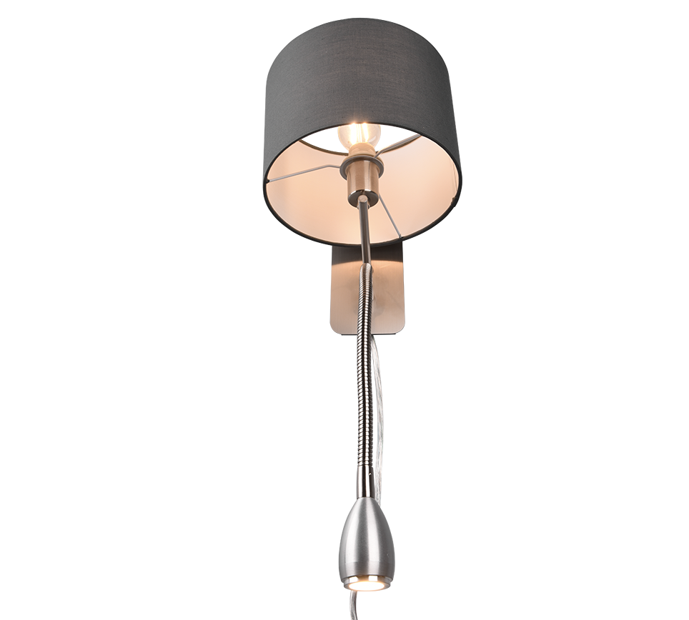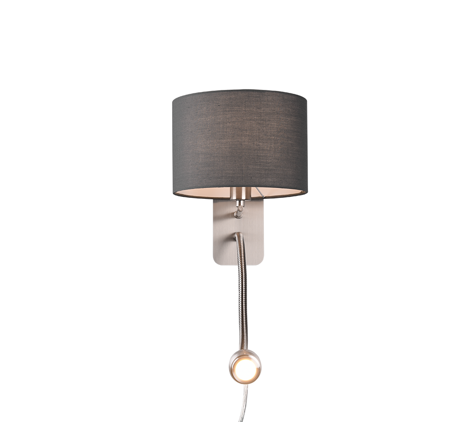 Lampen met stoffen kappen zorgen voor een sfeervolle stemming en behaaglijkheid. Via de stoffen kap wordt het licht zacht aan de omgeving afgegeven en wordt gezelligheid gecreëerd. De muurlamp HOTEL is geschikt als alternatief op het klassieke nachtlampje. De praktische leesarm kan immers door de Flex-Arm individueel gericht worden. Door twee schakelaars aan de kant van de lamp kunnen de hoofdkap en de leesarm apart van elkaar in- en uitgeschakeld worden. De strakke vorm van de lamp zorgt voor een aangename woonsfeer en geldt als klassieker in de decoratieve verlichting. Door de smaakvolle combinatie van de grijze kap met mat nikkel creëert de lamp een stijlvolle omgeving. Voor een energiebesparende verlichting is het gebruik van een ledlichtbron aanbevolen. Deze zijn een optimaal alternatief voor gewone halogeenlampen en staan voor een hoge lichtkwaliteit en een energiebesparing van tot 80%. Bovendien profiteert u bij ledlichtbronnen van een lange levensduur, een geringe warmteontwikkeling en spaart tegelijkertijd het milieu.