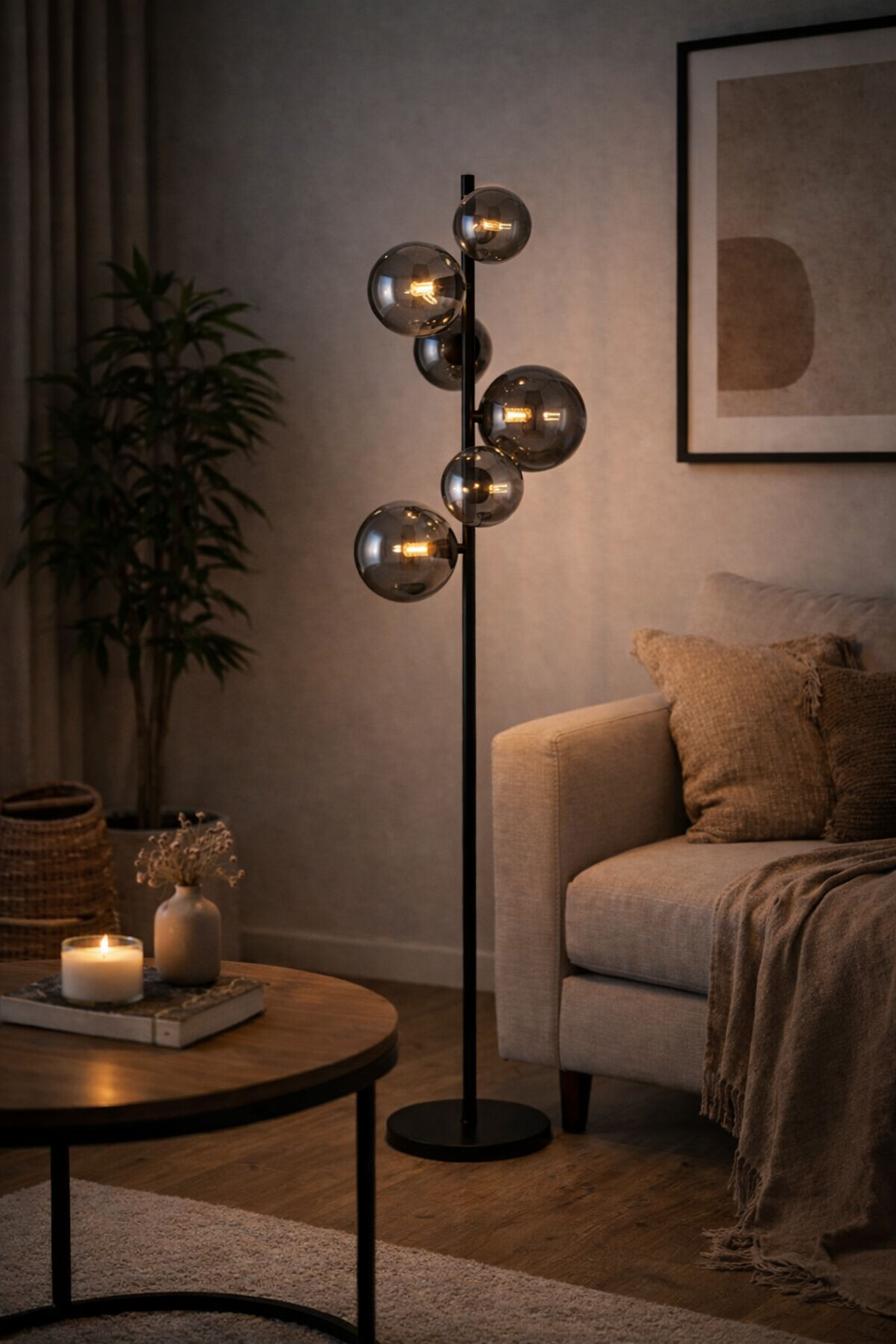 De Calcio vloerlamp is een stijlvolle designlamp met 6 smoke glazen bollen die zorgen voor een moderne en sfeervolle uitstraling. De combinatie van een zwart metalen frame en smoke glas geeft de lamp een strak en eigentijds karakter, perfect naast een bank, fauteuil of in een hoek van de woonkamer.