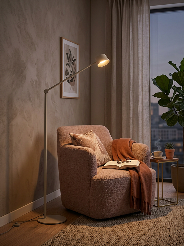 De Cugino vloerlamp van Freelight is een stijlvolle en functionele leeslamp met een rustige en elegante uitstraling. De zachte crème (zand) kleur maakt deze lamp perfect voor een modern, Scandinavisch of minimalistisch interieur. Dankzij het slanke ontwerp is deze vloerlamp ideaal naast een bank of fauteuil.