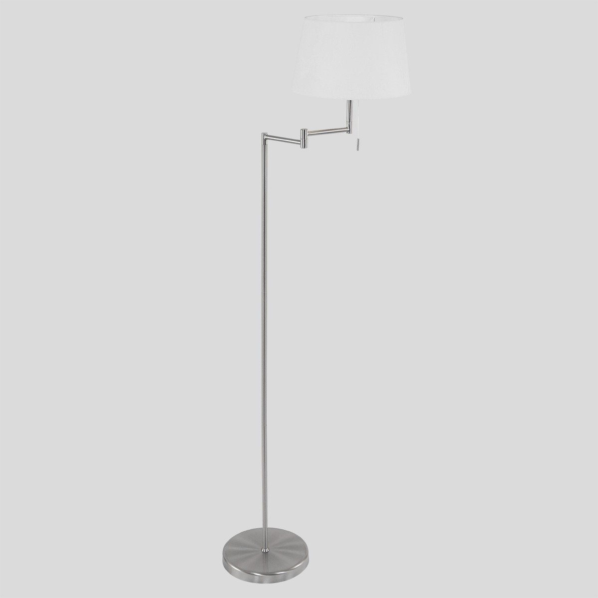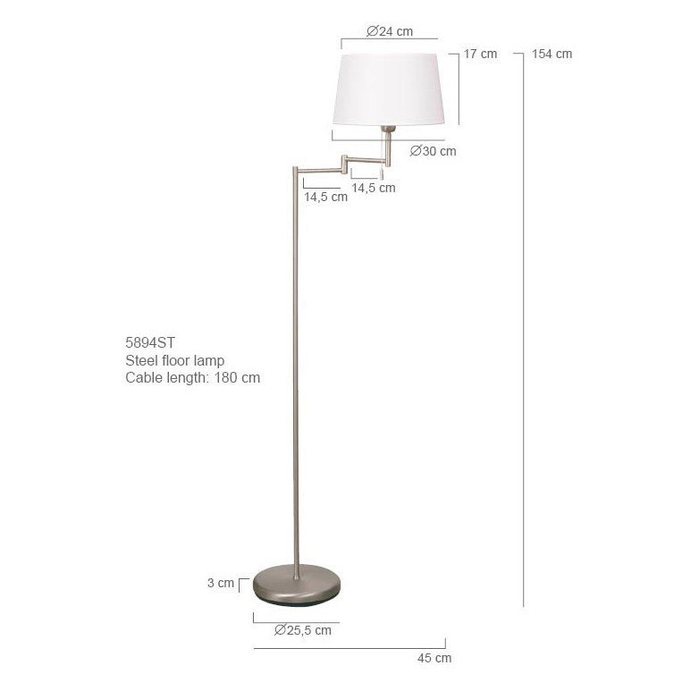 Een stalen vloerlamp uit de Mexlite Bella serie, die geleverd word inclusief stoffen kap. De zwenkarm zorgt ervoor dat deze lamp precies daar licht geeft waar dit gewenst is. De Bella is te bedienen middels een aan/uit schakelaar in de vorm van een trektrouw. Beschikt over een E27 fitting en geschikt voor lichtbronnen tot maximaal 60 watt. De totale hoogte is 154 centimeter en heeft een reikwijdte van 45 centimeter. De kap is aan de bovenkant 24 centimeter in doornsnede en aan de onderkant 30 centimeter, de hoogte van de kap is 17 centimeter. Wordt geleverd met snoer van 180 centimeter