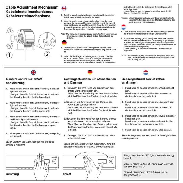 De geïntegreerde bewegingssensor aan de zijkant maakt bediening eenvoudig en intuïtief. Met een simpele handbeweging schakelt u de lamp in of uit, dimt u de verlichting en regelt u het boven- en onderlicht afzonderlijk. Zo creëert u moeiteloos de juiste sfeer voor elk moment van de dag.
