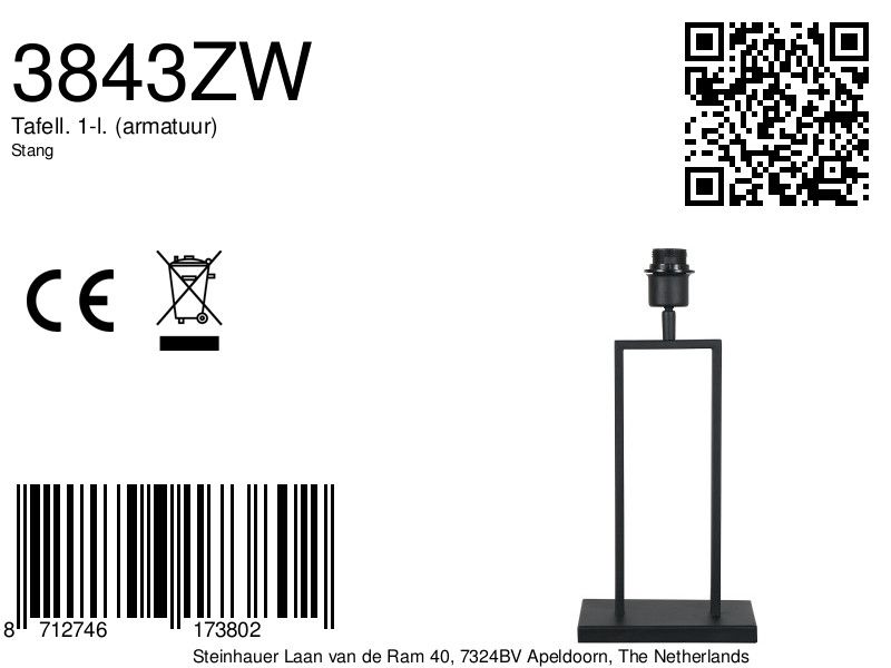 Zwarte tafellamp Stang 3843ZW met E27 fitting zonder kap