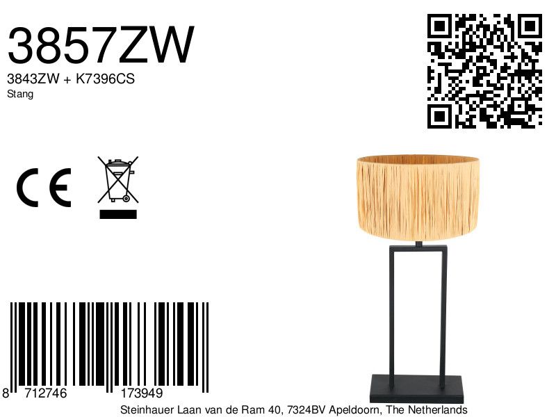 Zwarte tafellamp Stang 3857ZW met E27 fitting en naturel gras kap